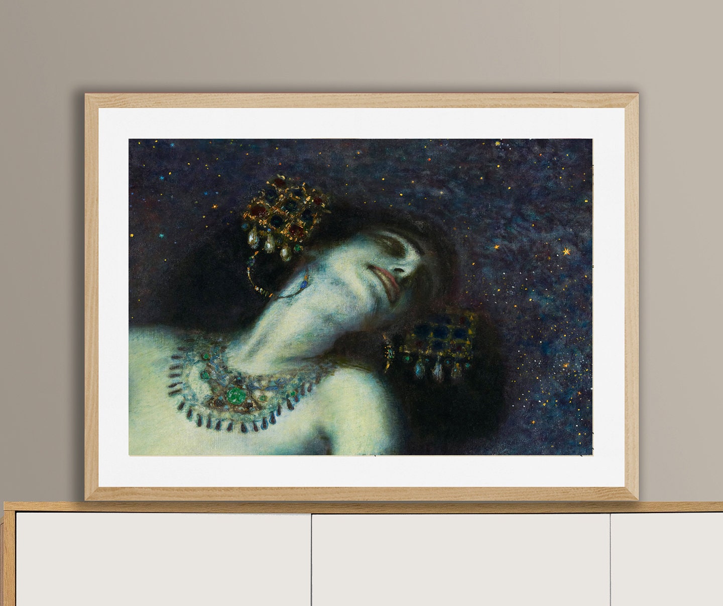 Franz von Stuck’s Salome is one of the most mesmerizing depictions of the biblical femme fatale, embodying themes of seduction, power, and doom. This particular detail of the painting focuses on a close-up of Salome herself, highlighting von Stuck’s signature use of rich symbolism, dramatic lighting, and intense psychological depth.