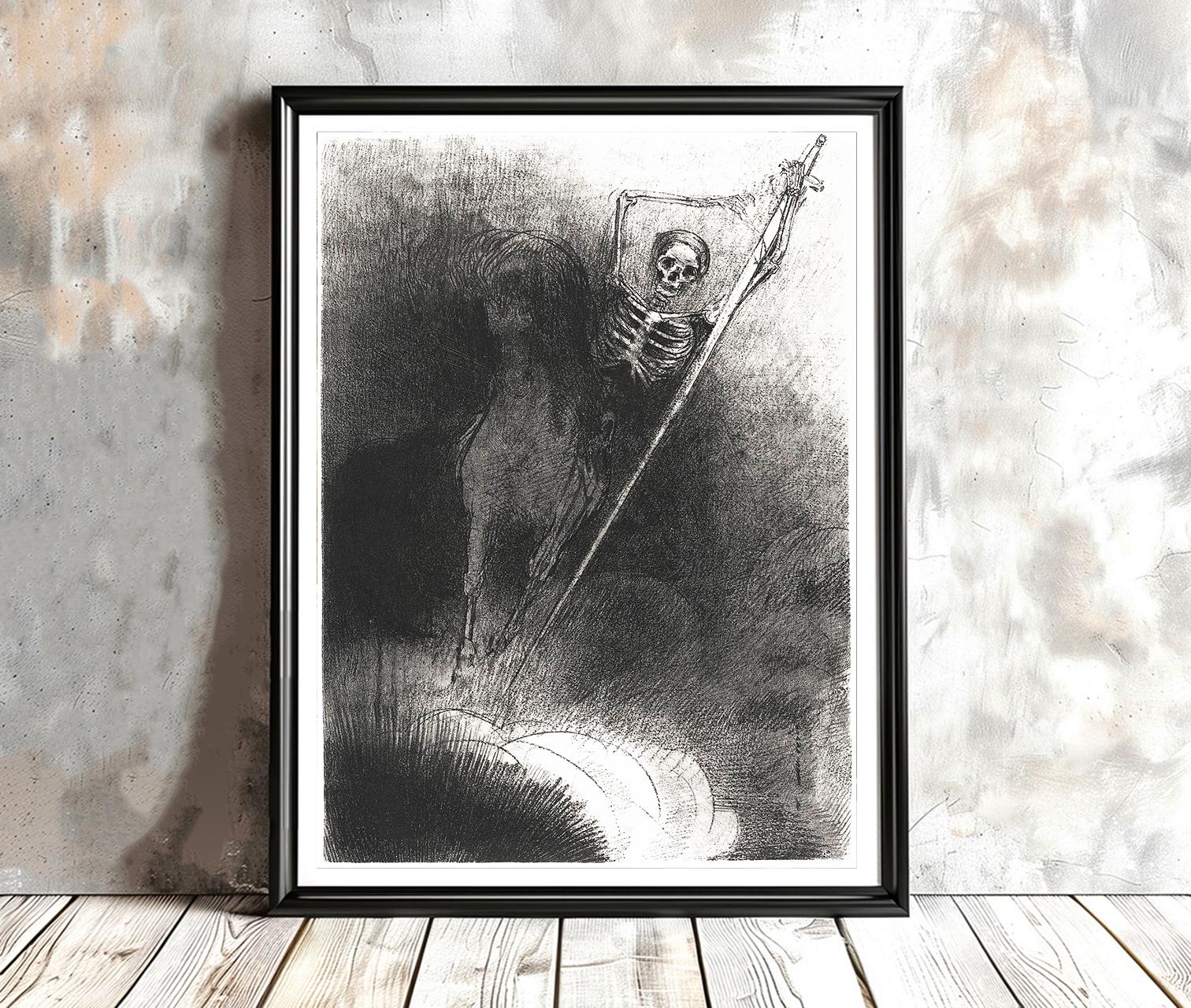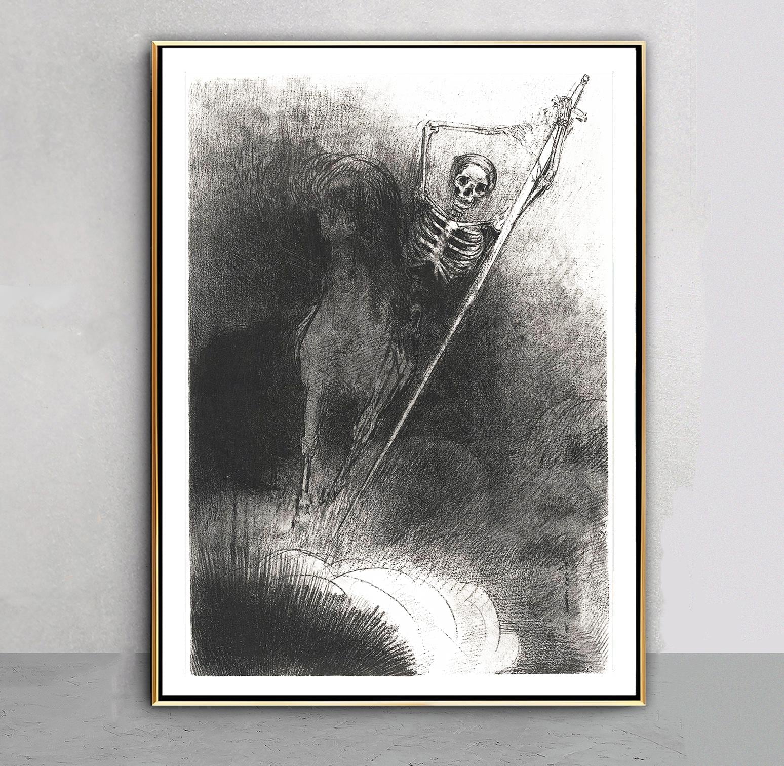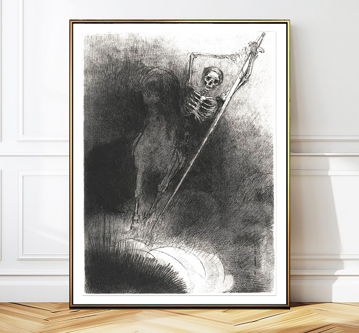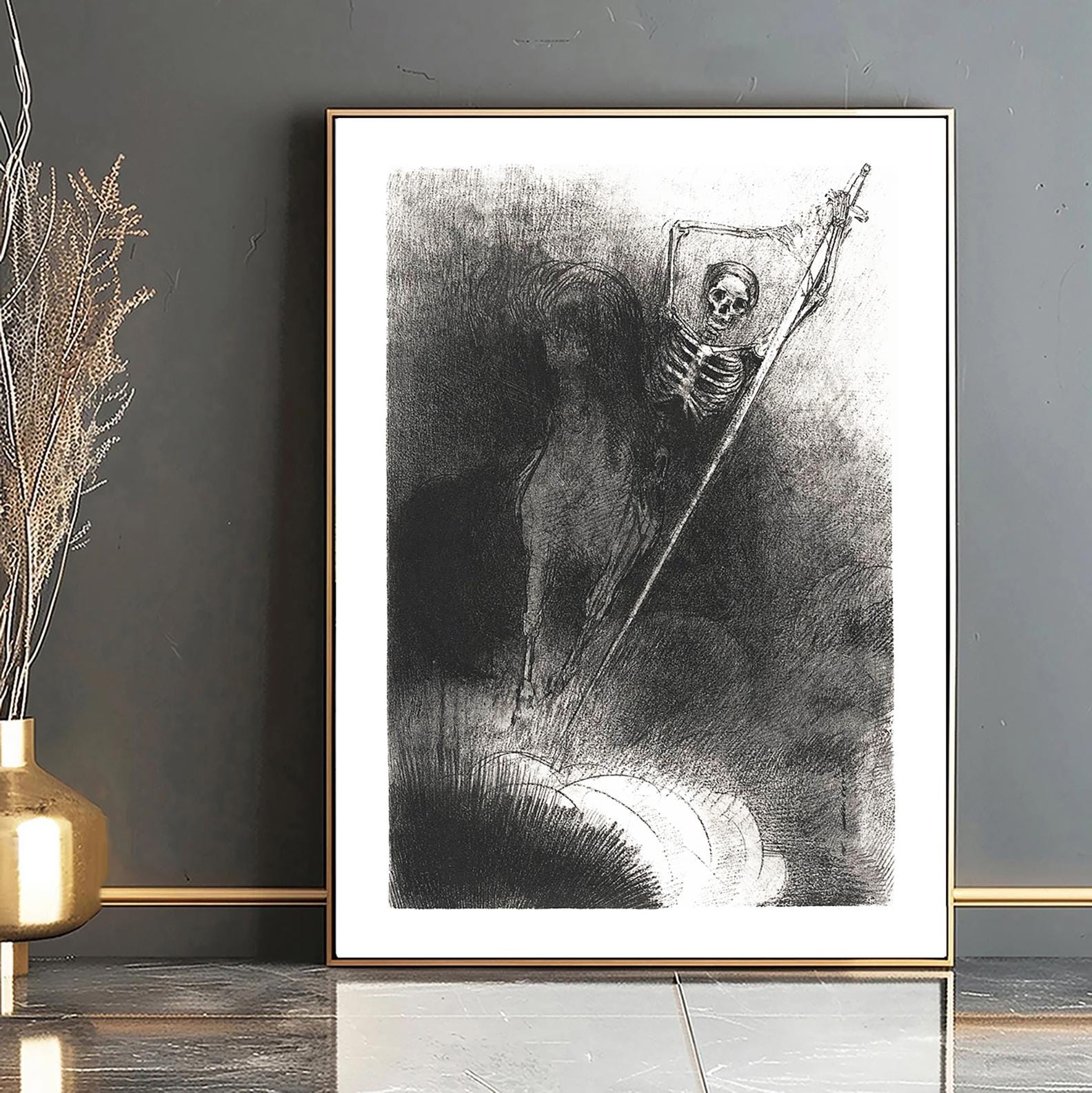 Skeleton on Horseback by Odilon Redon Fine Art Print - Symbolist Art, Dreamlike Composition, Black and White Art - Poster Paper, Canvas Print