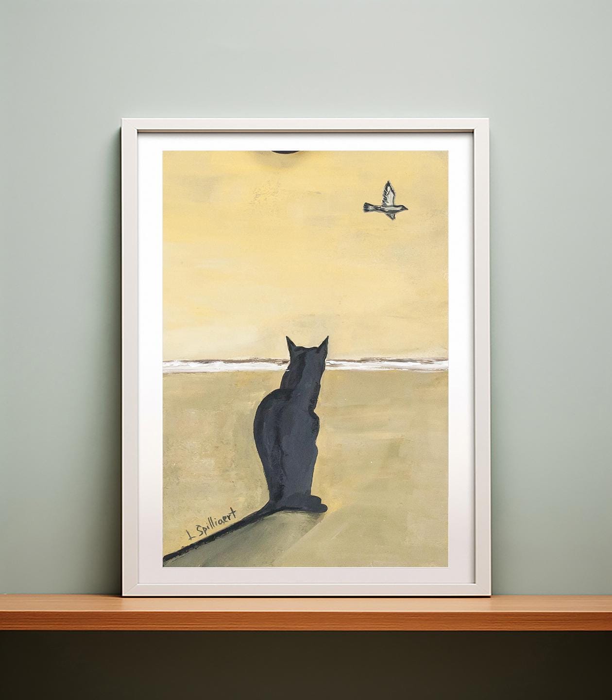 Leon Spilliaert Cat Art Print: Black Cat on Beach, Bird Flying
