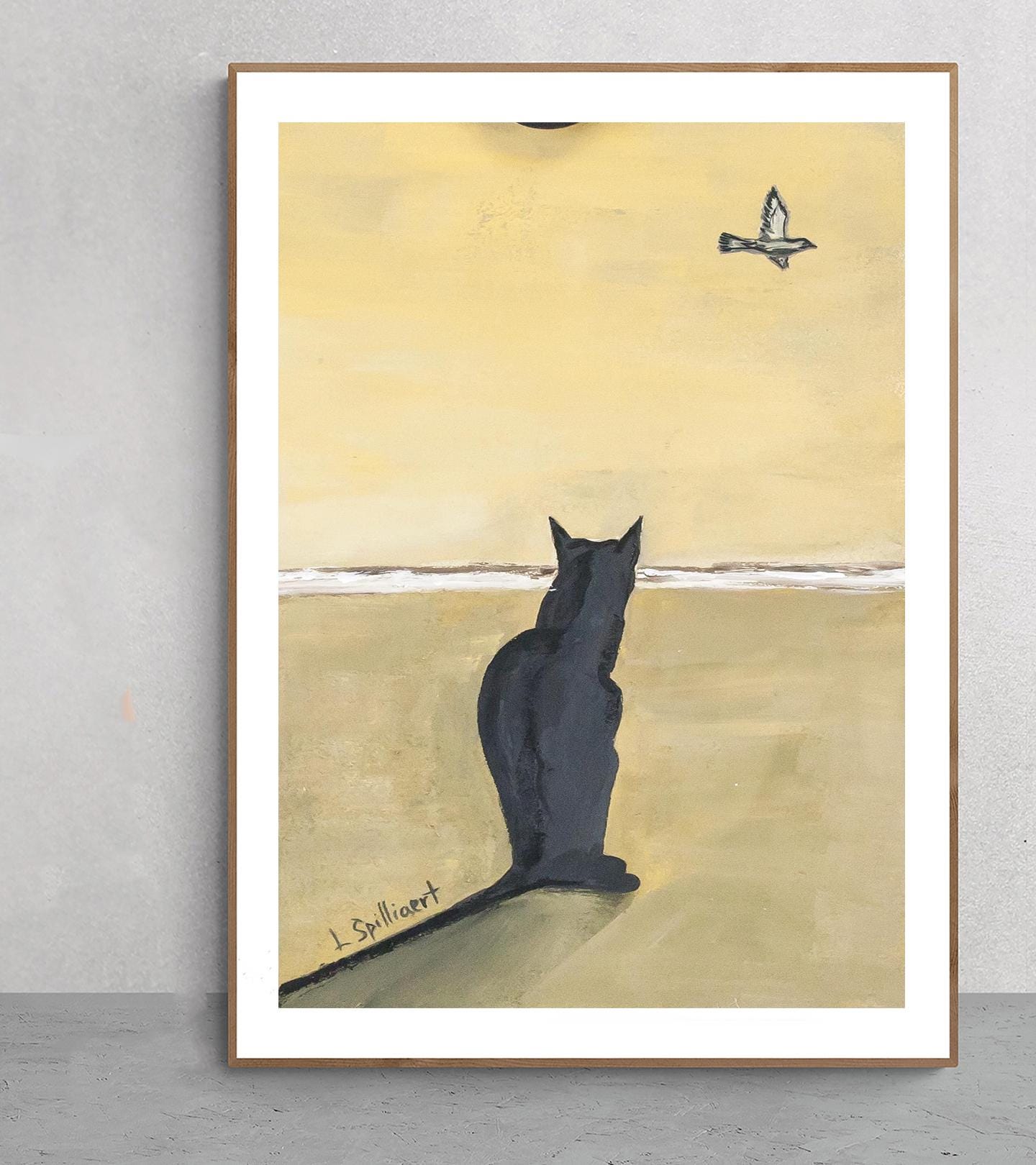 A Black Cat Sitting on a Beach with a Bird Flying Overhead by Leon Spilliaert Fine Art Print - Poster Paper, Canvas Print