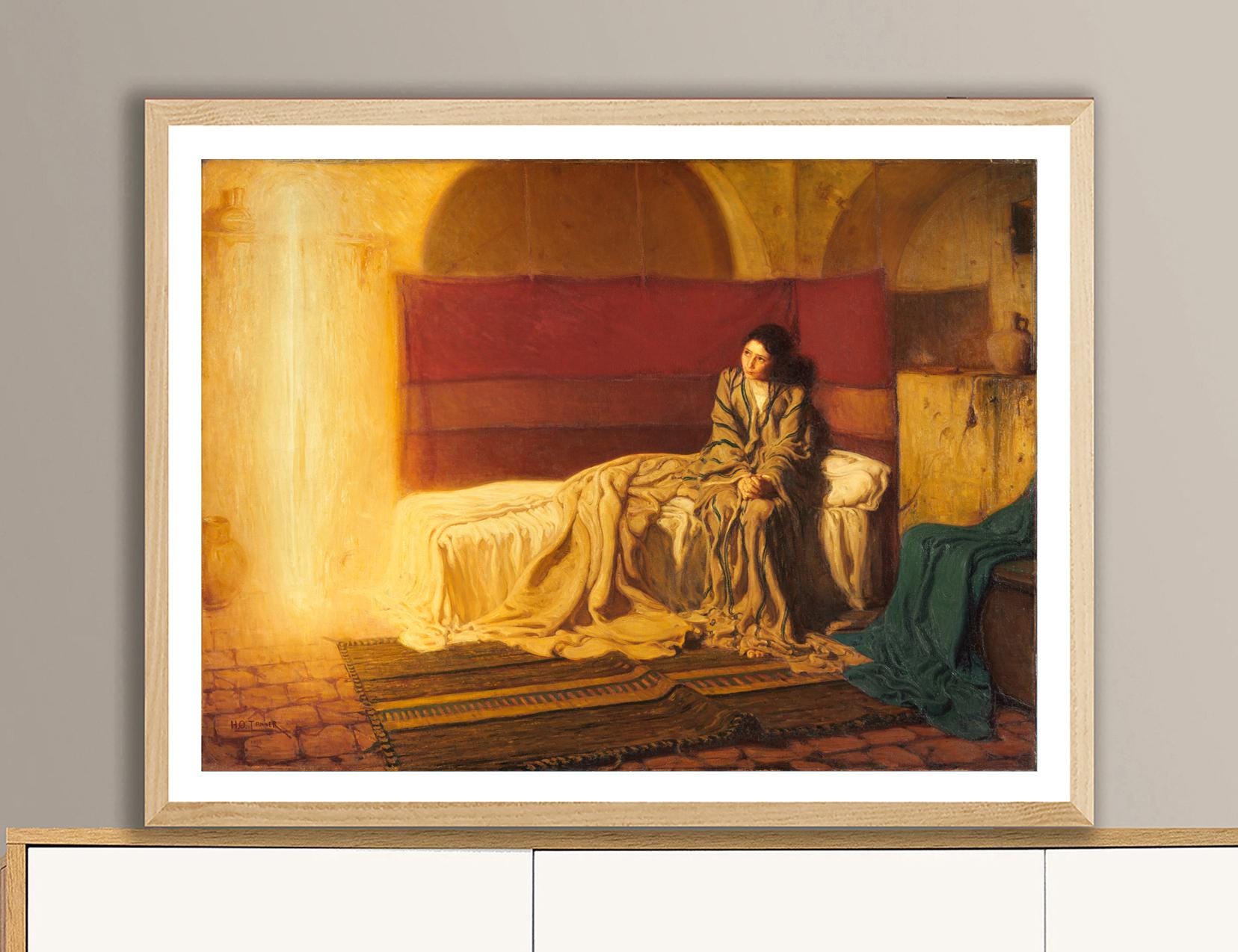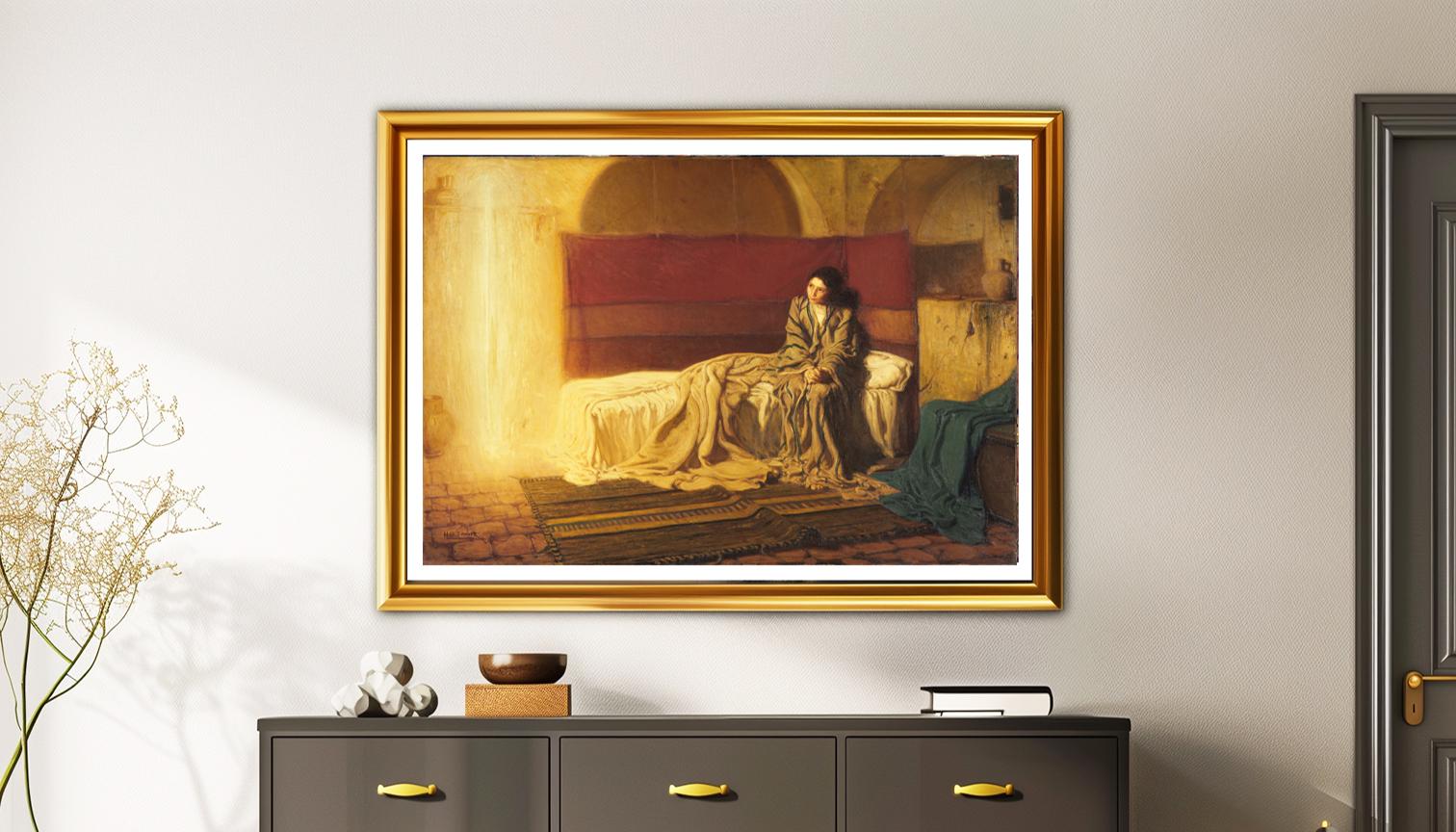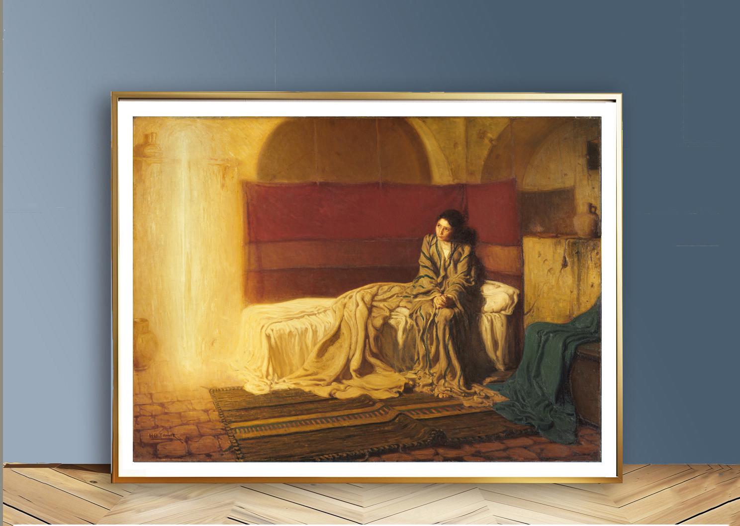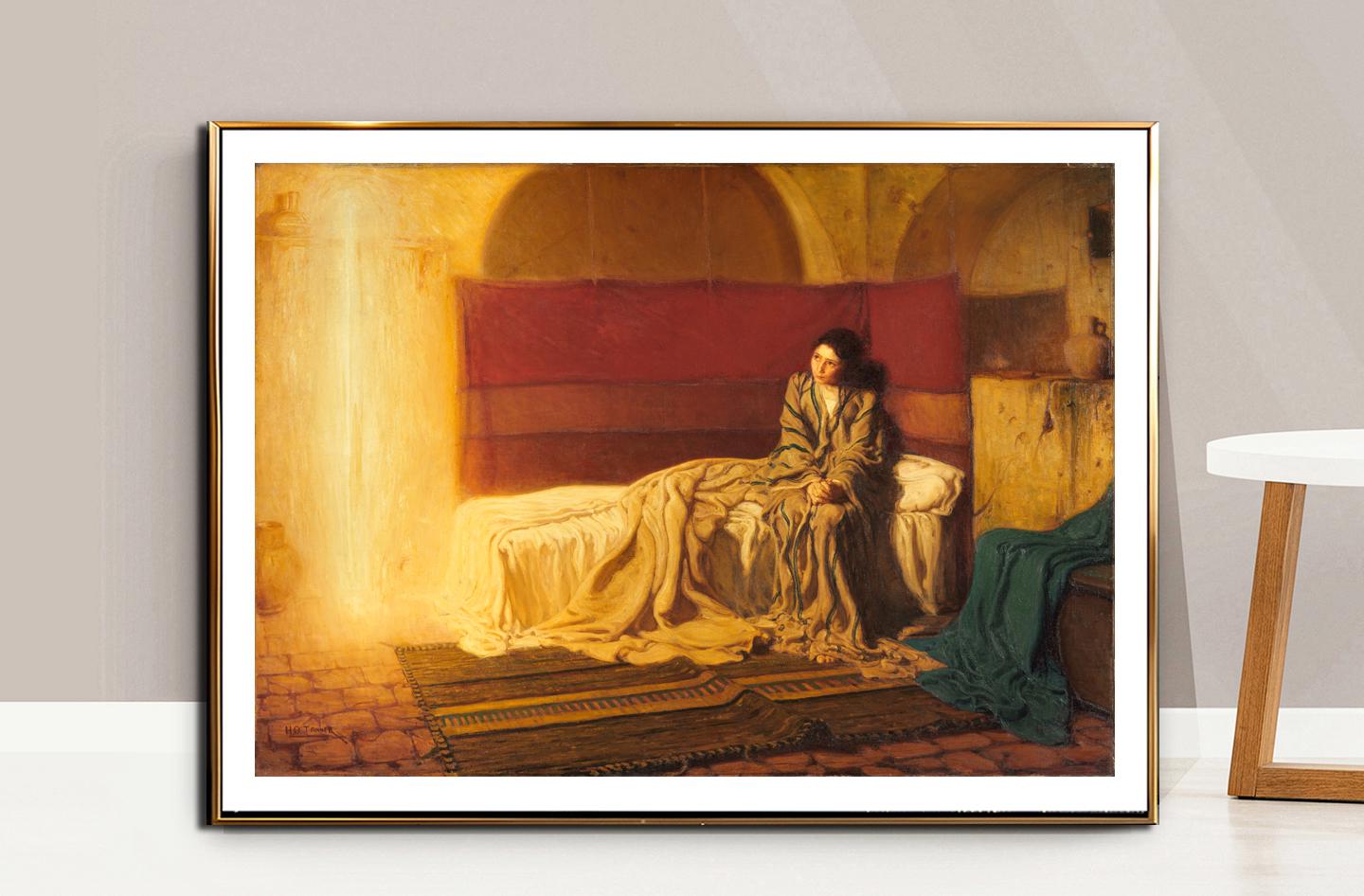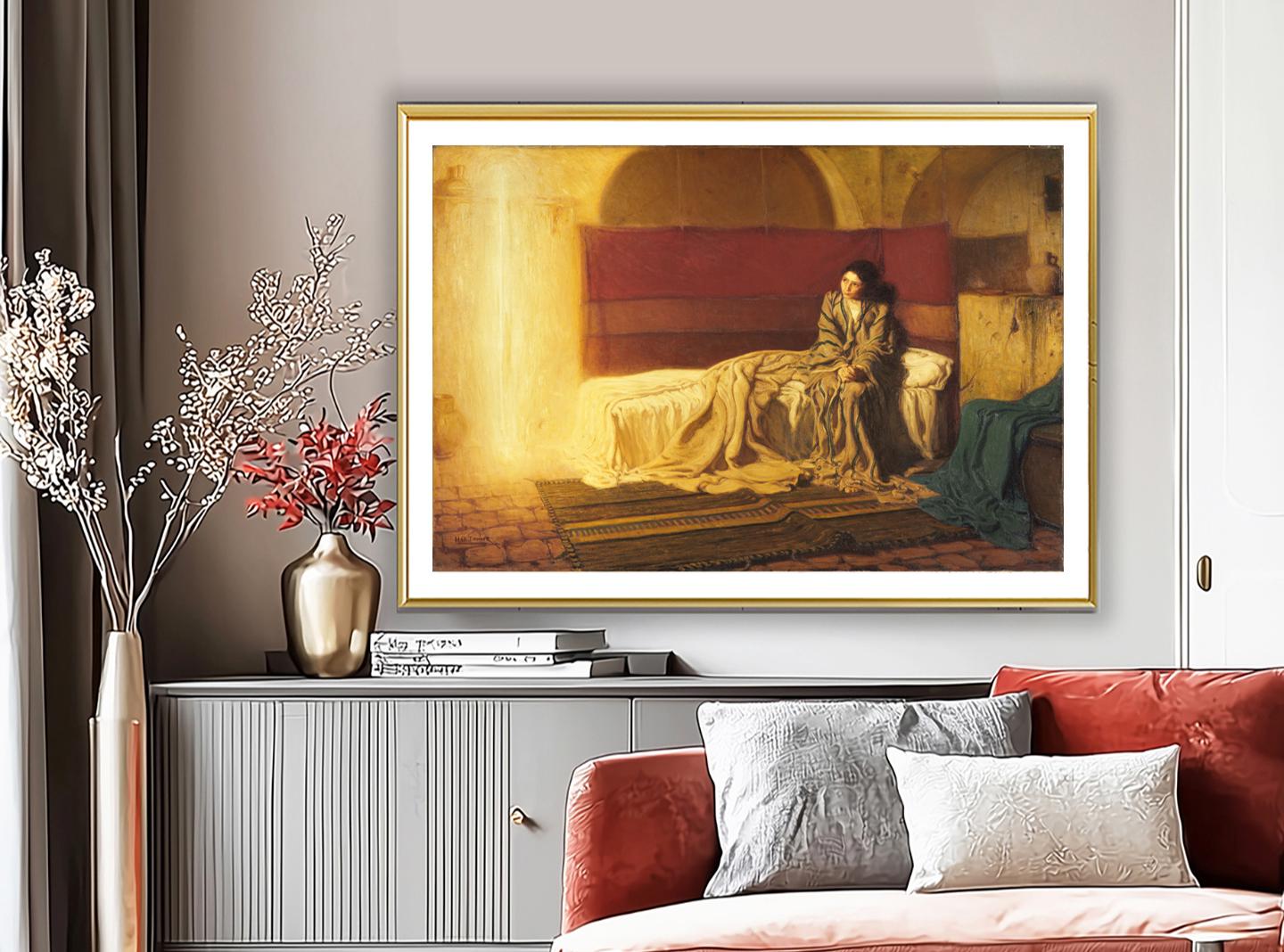 In this oil painting, Mary is seated on a bed, draped in simple garments, her posture reflecting astonishment and deep thought. The angel Gabriel is not depicted as a winged figure but rather as a column of radiant light, a choice that aligns with Tanner’s realist approach while maintaining the supernatural essence of the scene. The room is modestly furnished, with warm golden light spilling into the space, reinforcing the divine presence without overwhelming the viewer with excessive ornamentation.