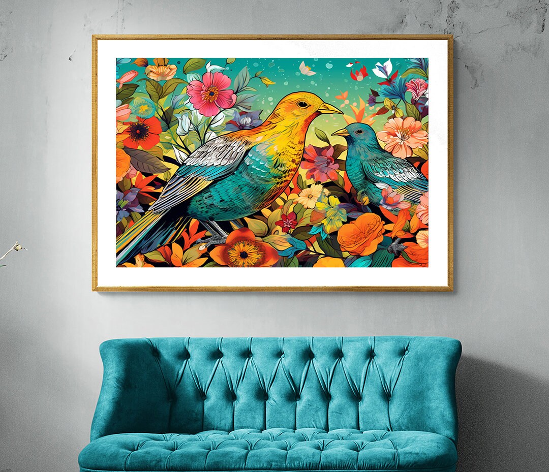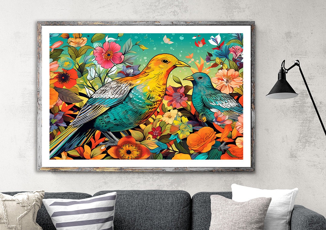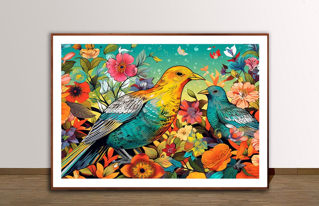 Birds in Garden Art Print: Colorful Floral Illustration