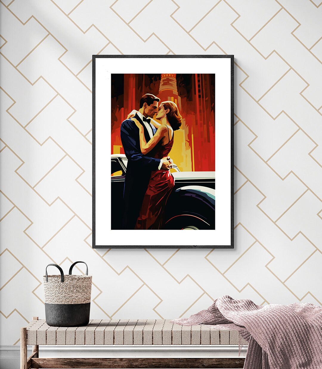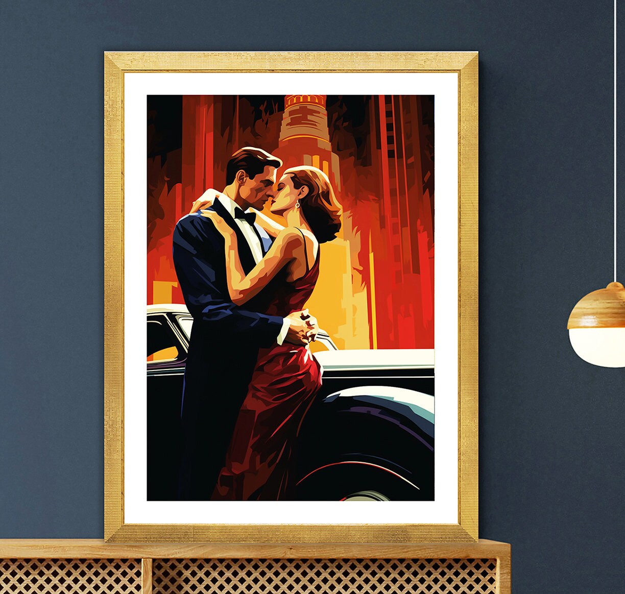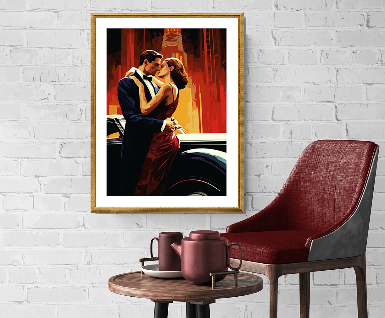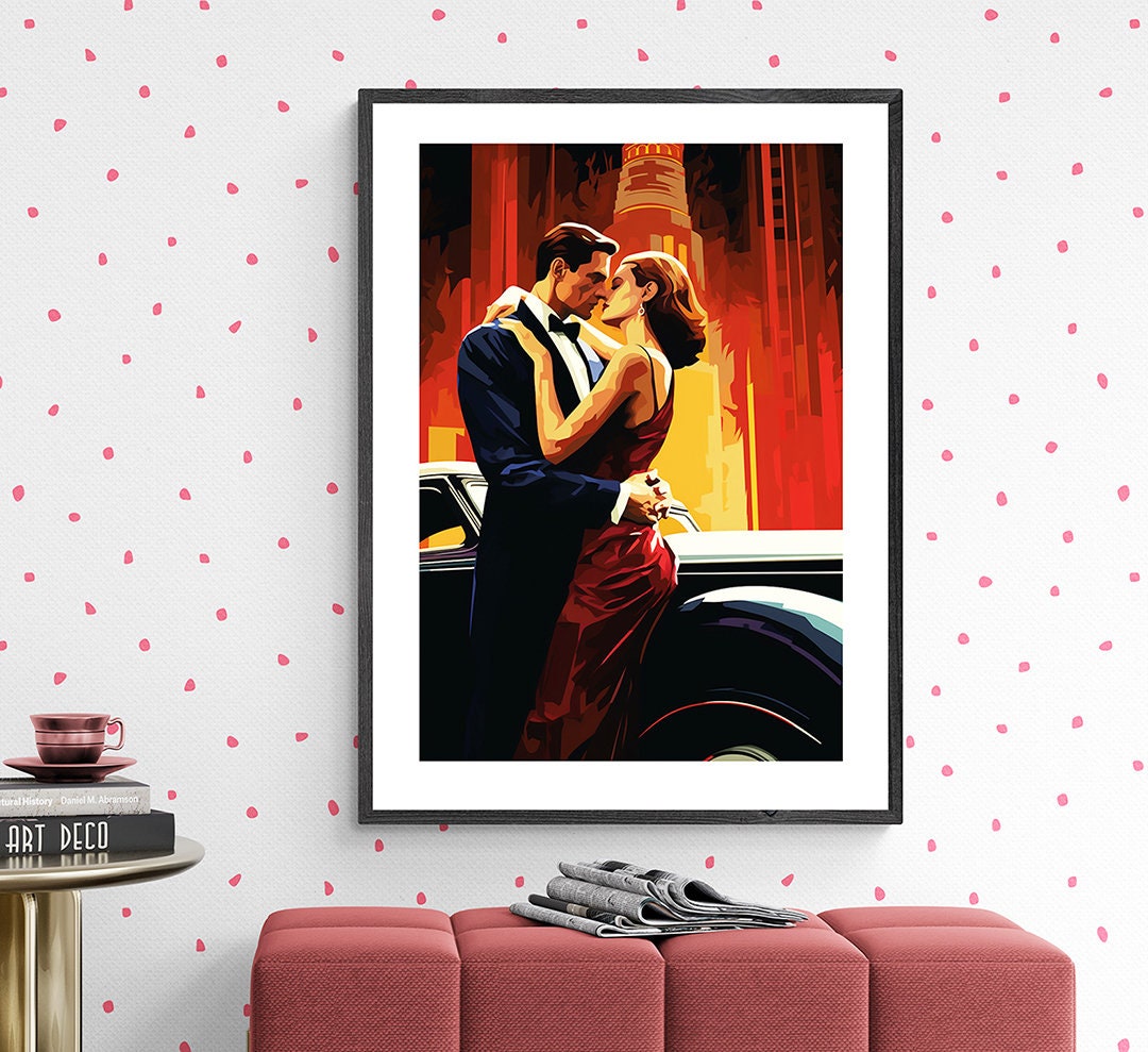 Love Kiss Art Deco Print: Lovers by Car, Modern Wall Decor