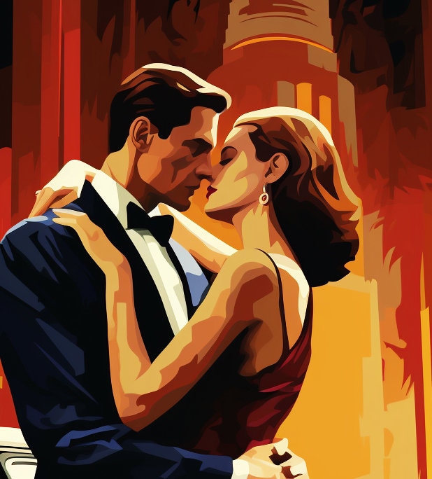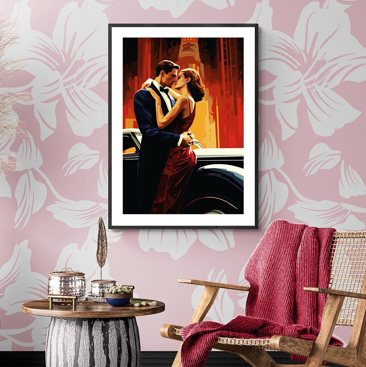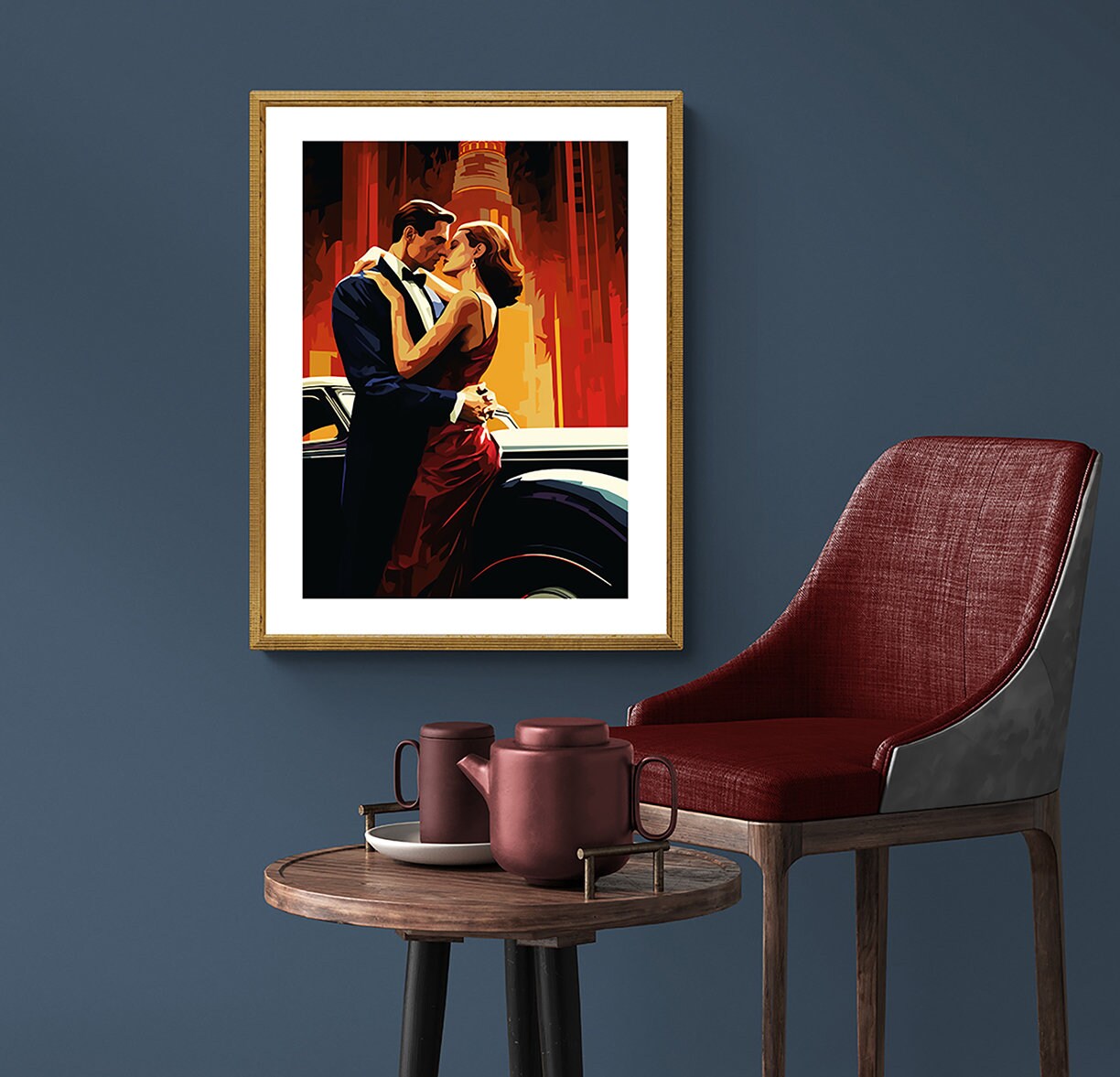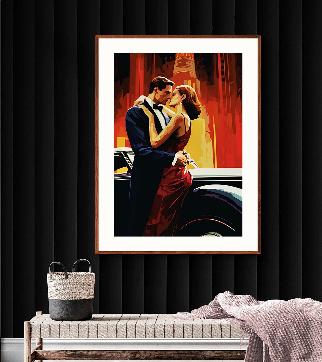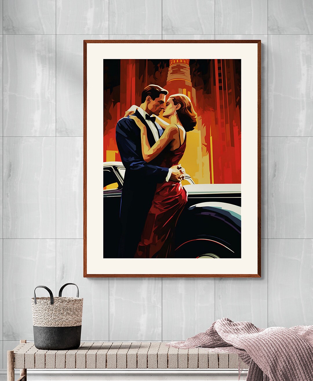 Love Kiss Art Deco Print: Lovers by Car, Modern Wall Decor