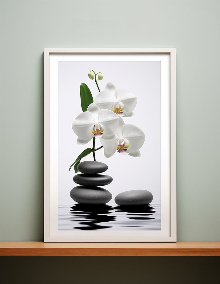 Bathroom Decor, White Orchid and Pebbles Fine Art Print - Modern Wall Decor / Gift Idea / Home Decor