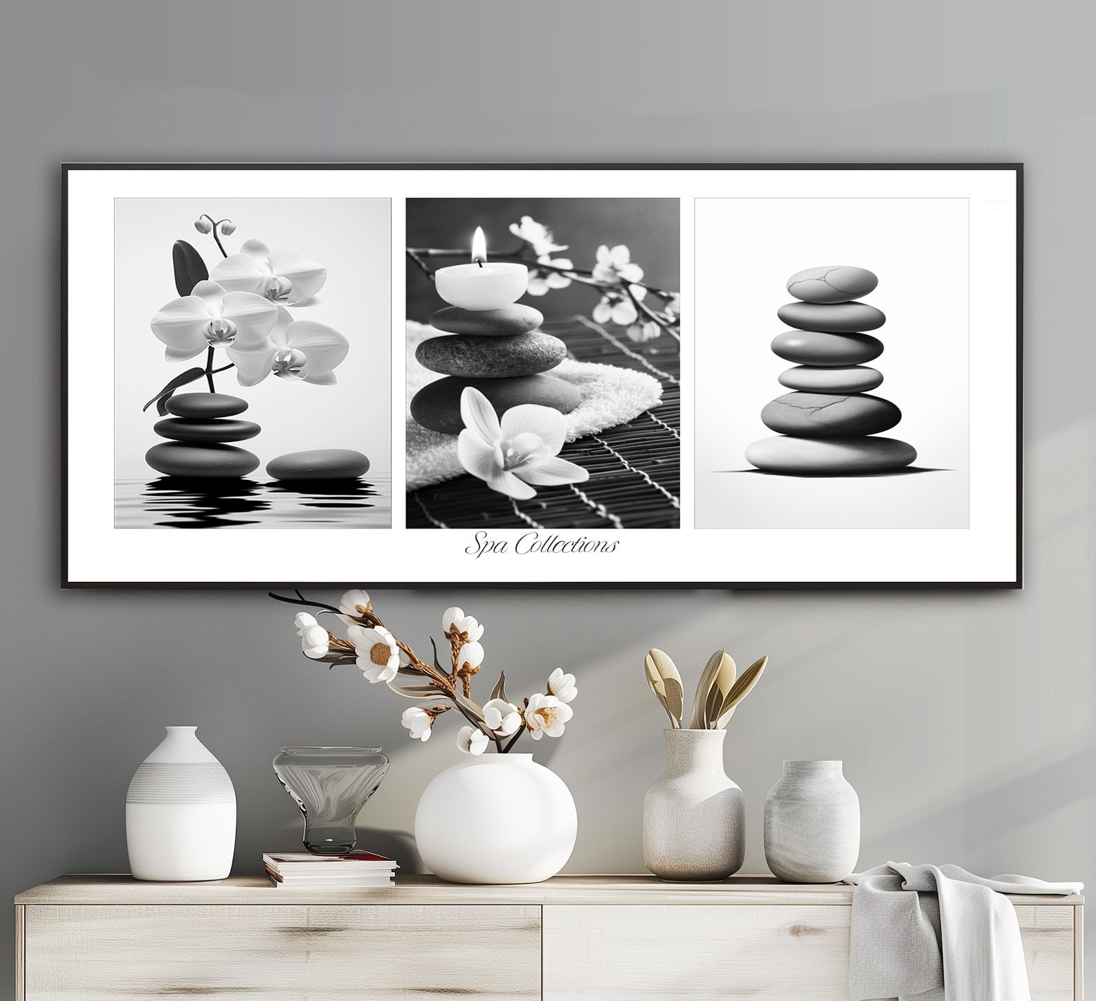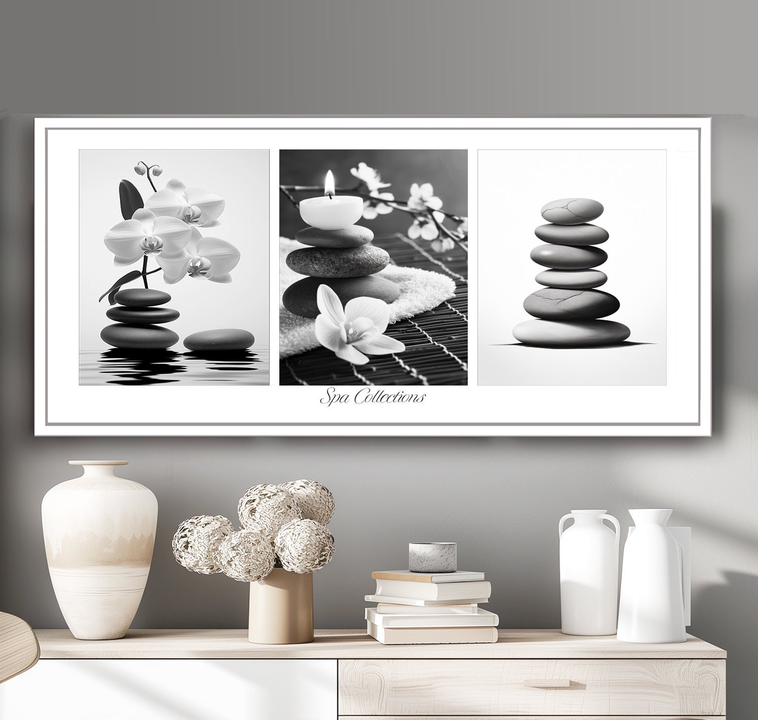 Black and White Spa Stone Print: Modern Floral Botanical Wall Decor