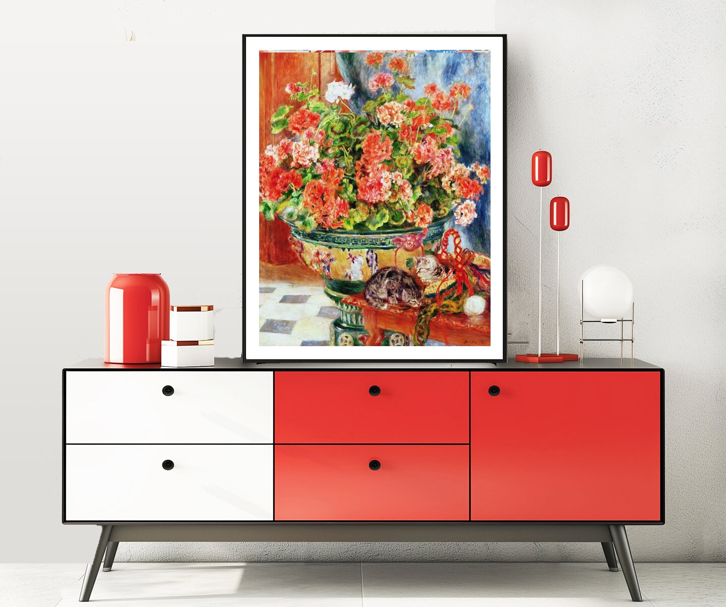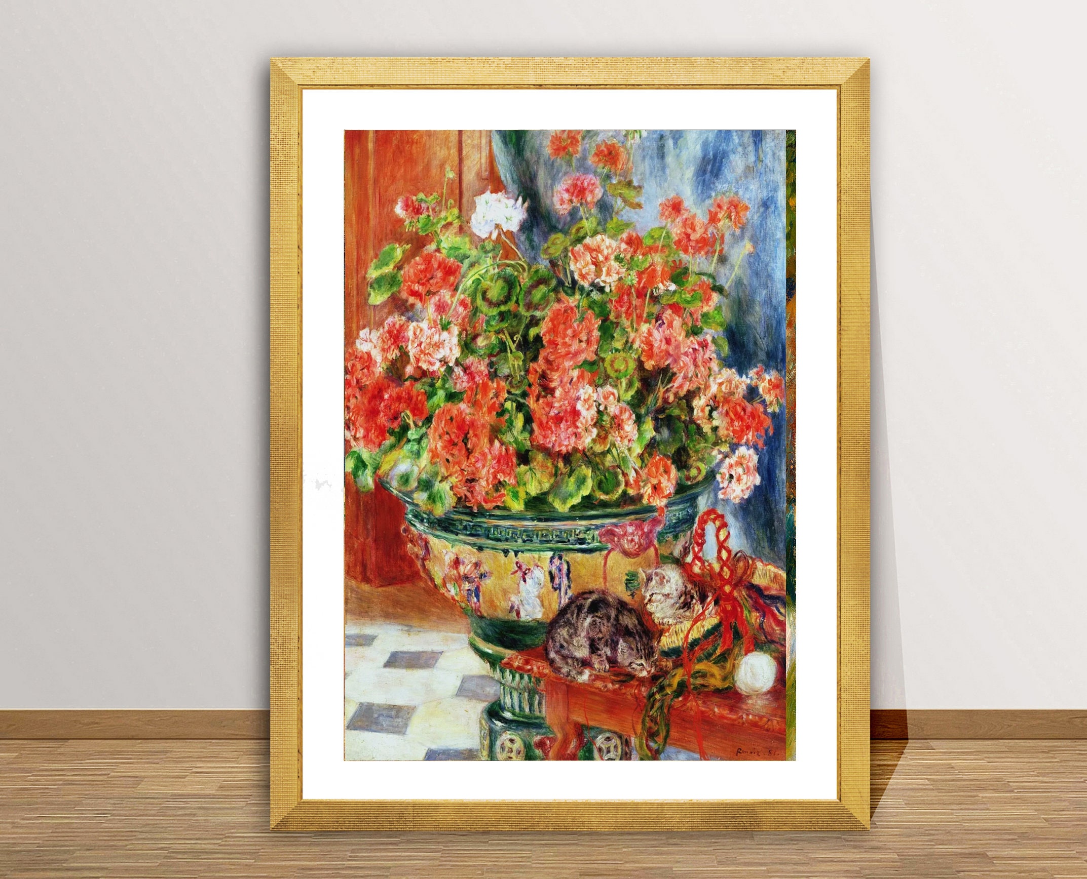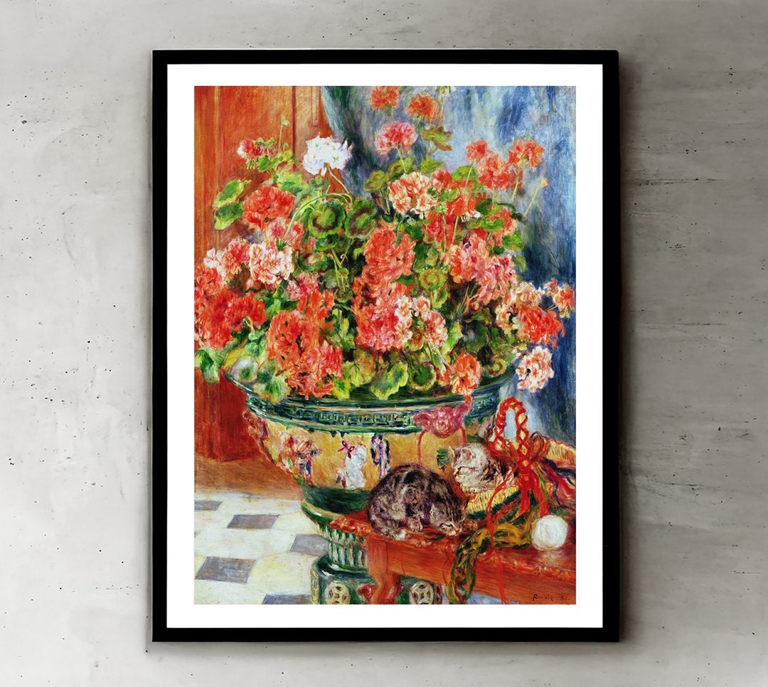 Geraniums and Cats by Pierre Auguste Renoir - Still Life Geraniums / Gift Idea / Wall Decor - Poster Paper or Canvas Print / Gift Idea