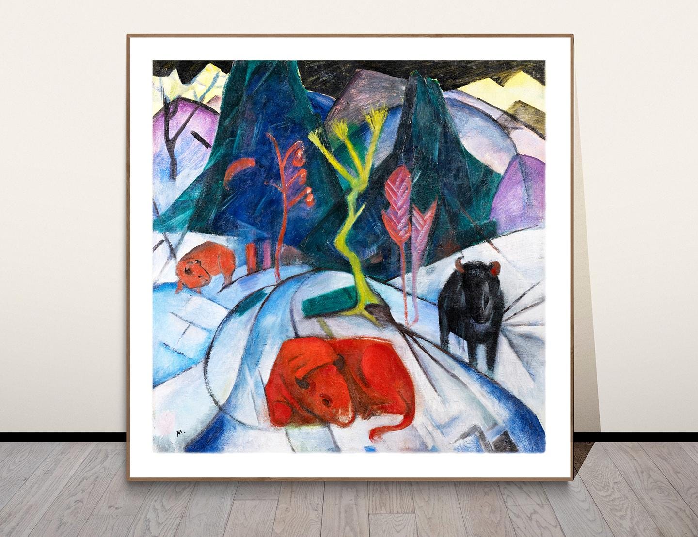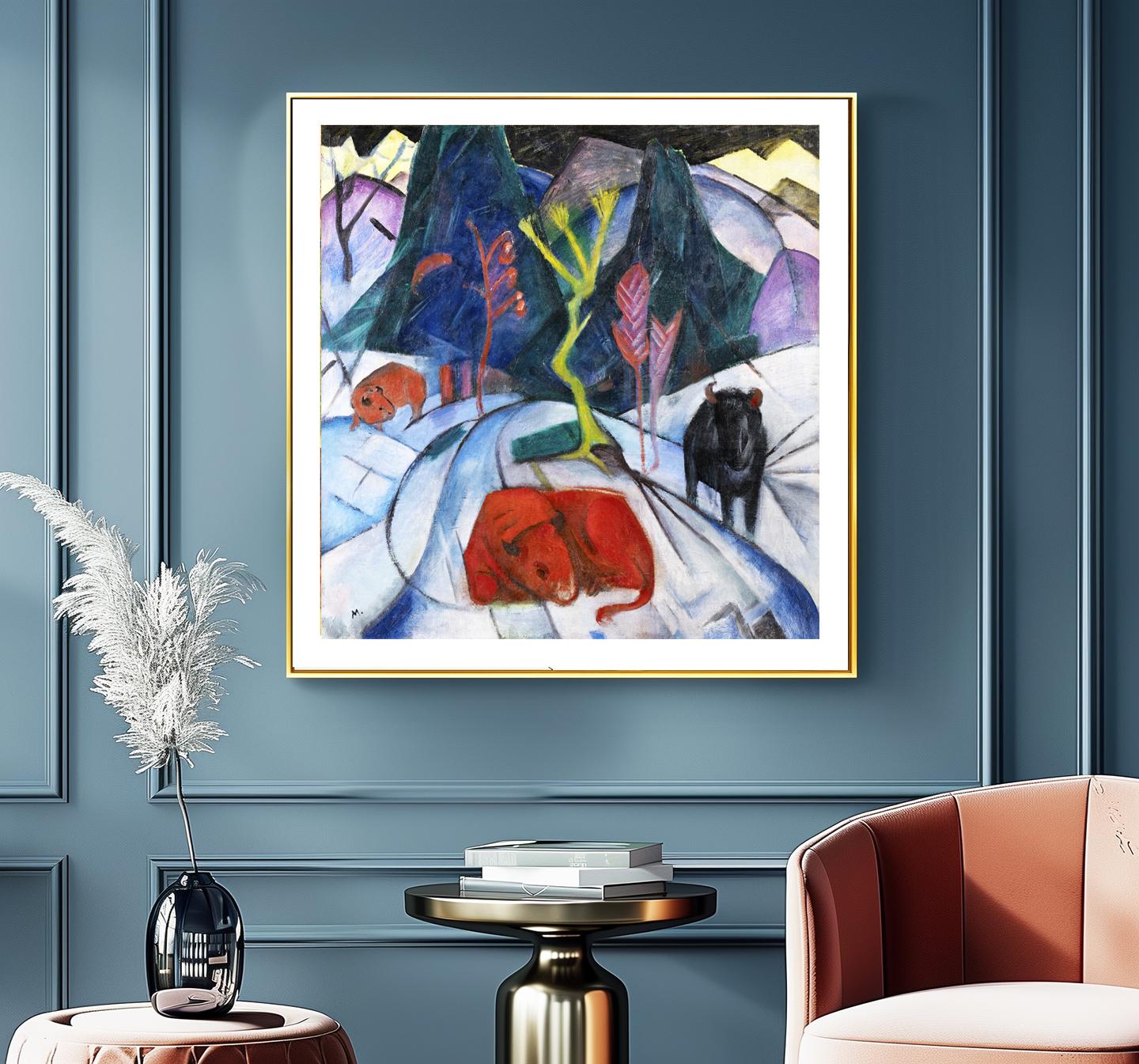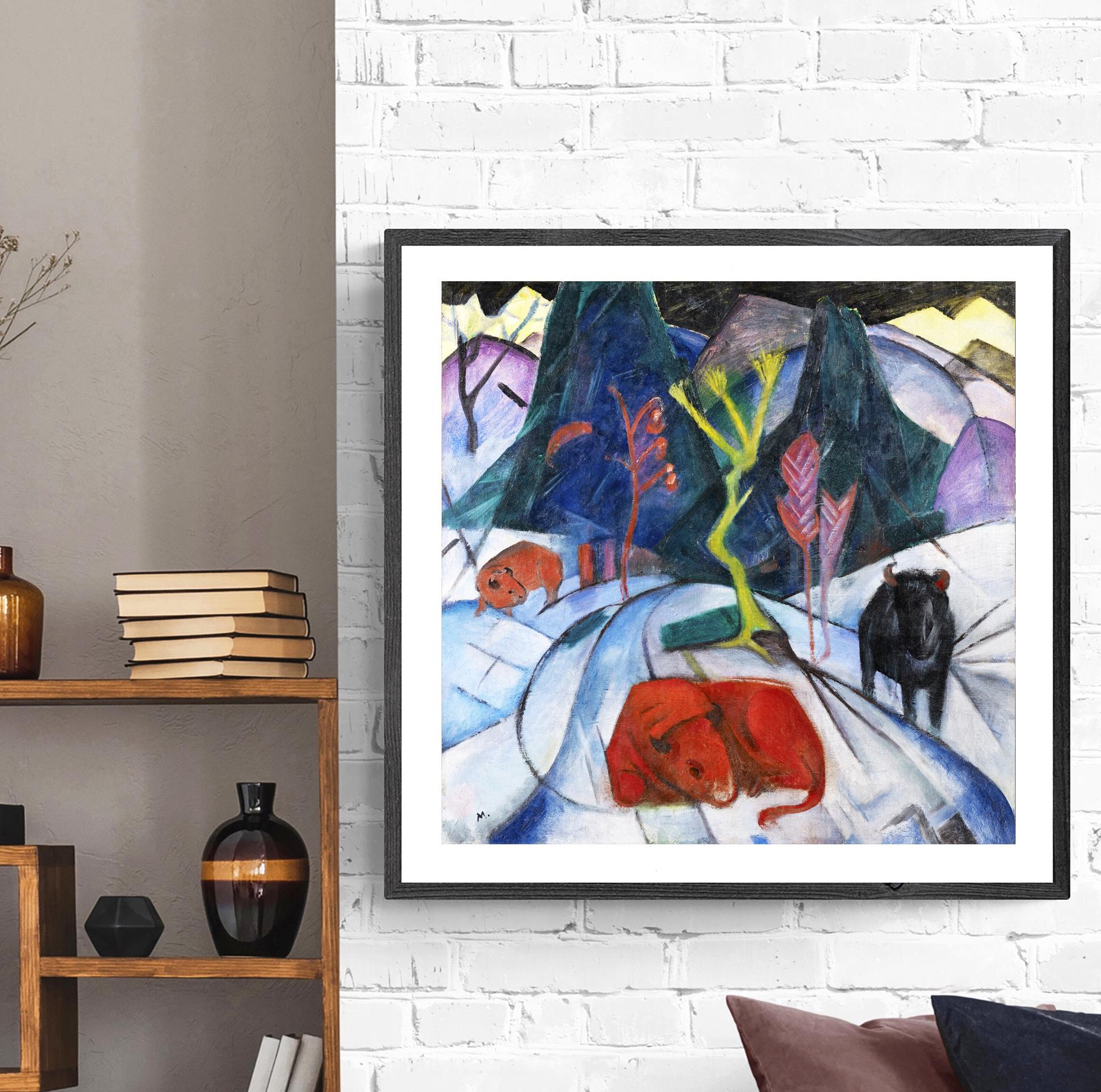 Bison in Winter" (also known as "Red Bison") is a powerful and vibrant painting by Franz Marc, created in 1911. Known for his bold use of color and emotional expression, Marc was a key figure in the Expressionist movement and one of the founding members of the Der Blaue Reiter group, alongside Wassily Kandinsky.