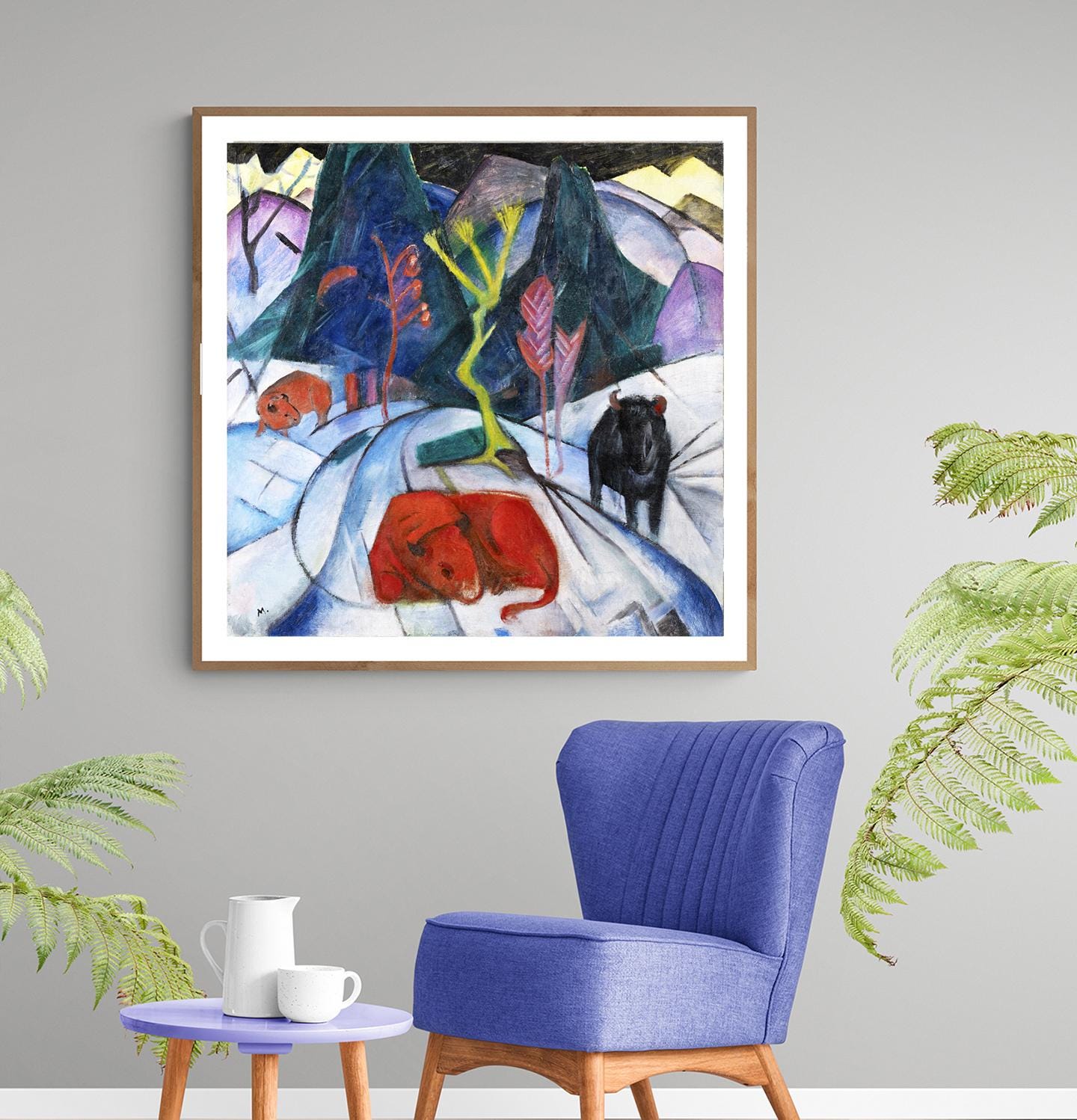 Printed on high quality paper, cotton canvas or adhesive sticker paper. A high quality reproduction of painting by Franz Marc. Professional packaging for safe shipping. Natural white border will be added to the image for mounting and framing.