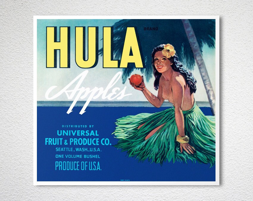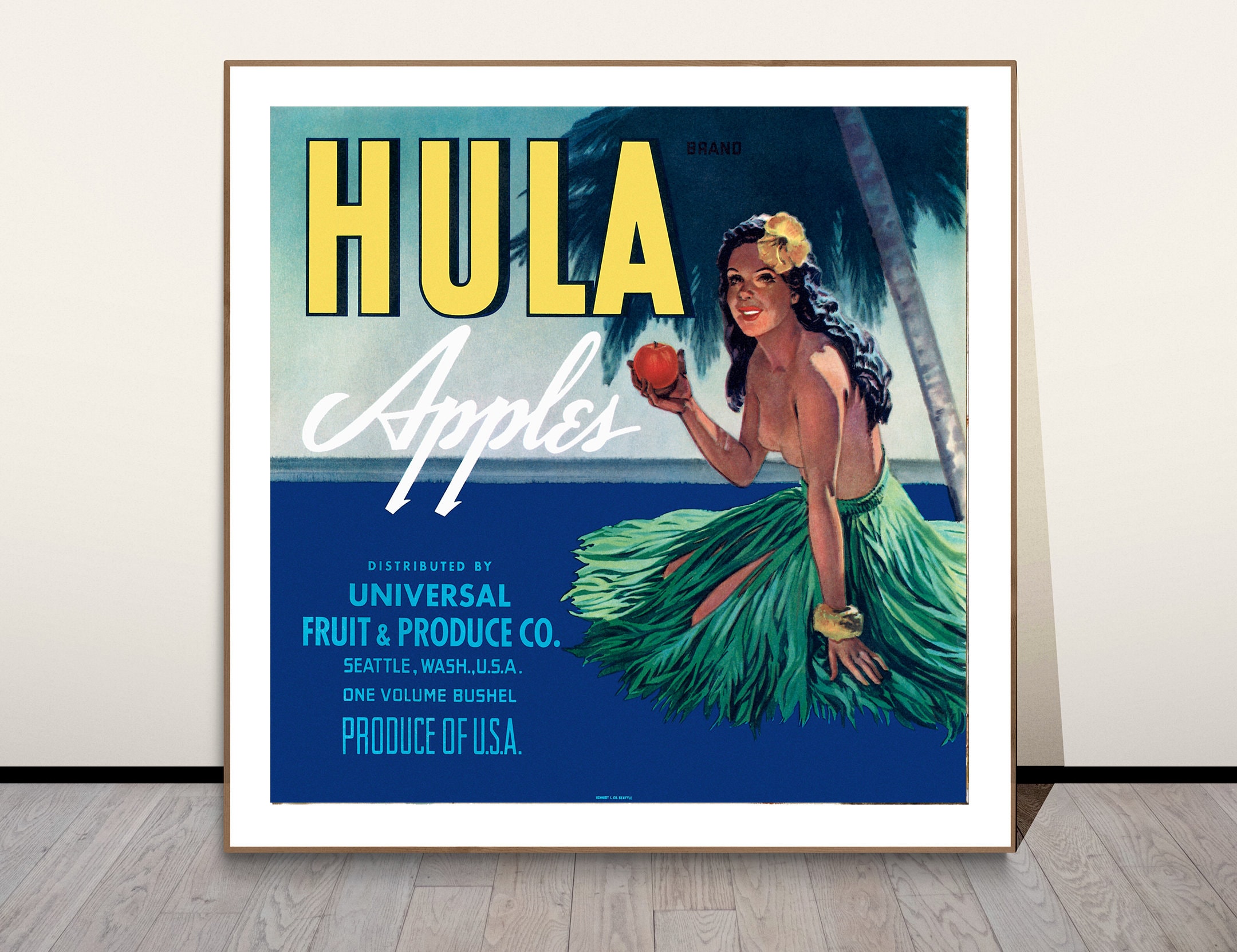 Hula Apples, Crate Label with Topless Hula Girl Vintage Wall Art, Retro Artwork, Travel Painting, Exotic Wall Décor, Hawai Poster - Poster Paper or Canvas Print
