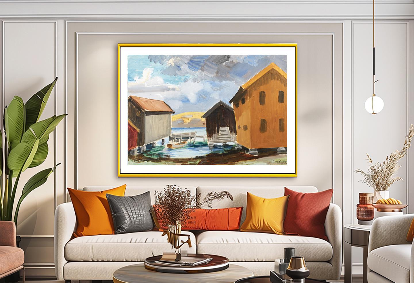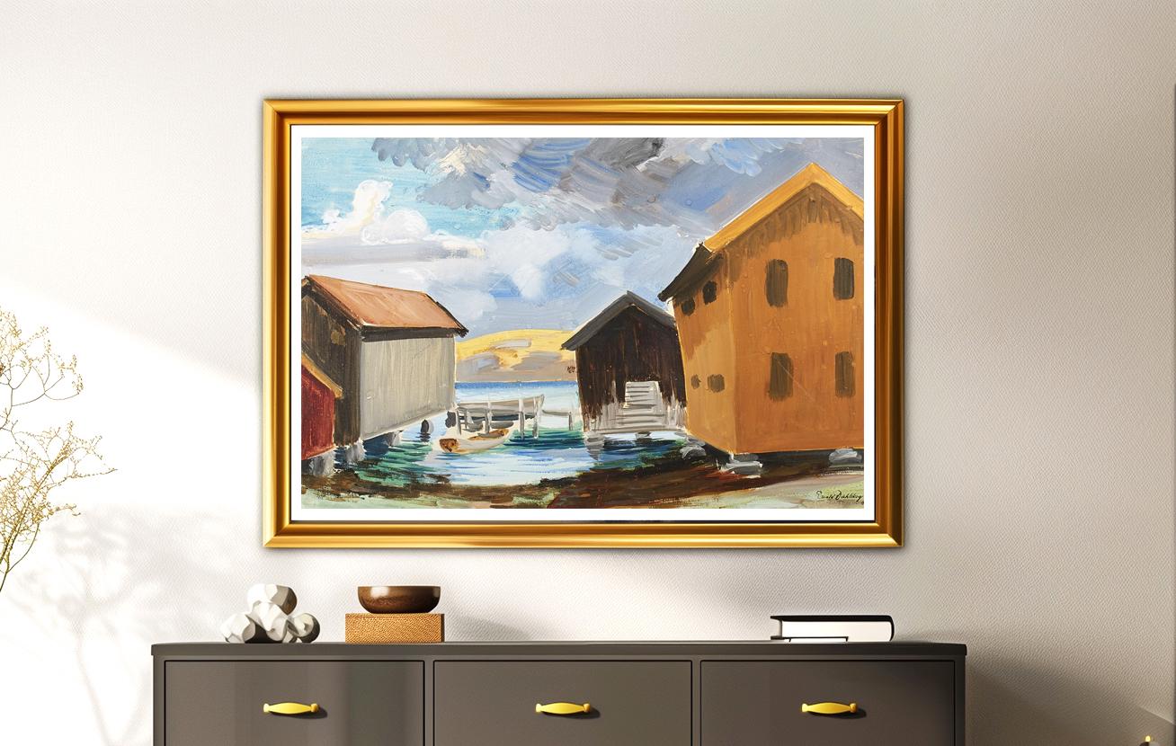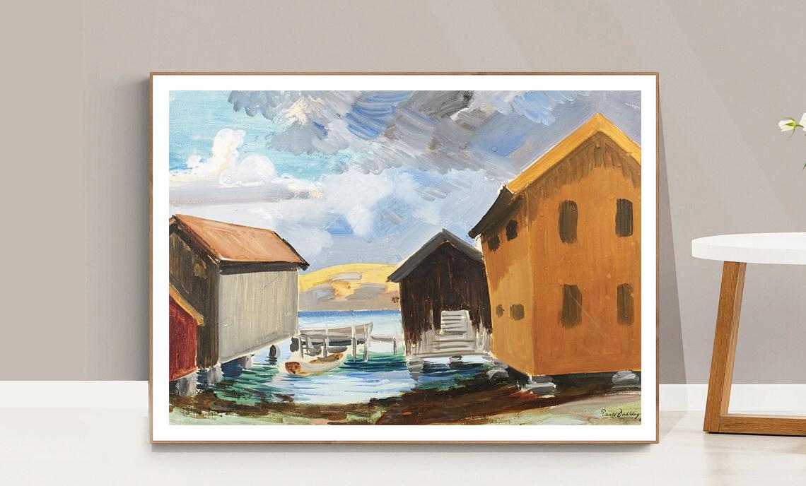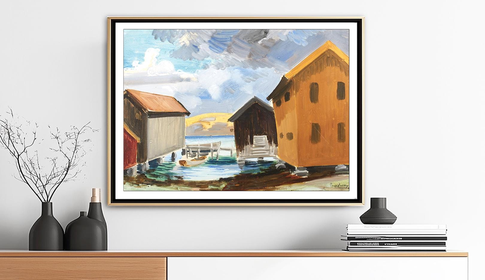 Sjöbodar, Sweden by Ewald Dahlskog Fine Art Print - Boathouses Painting / Gift Idea / Nautical Wall Art