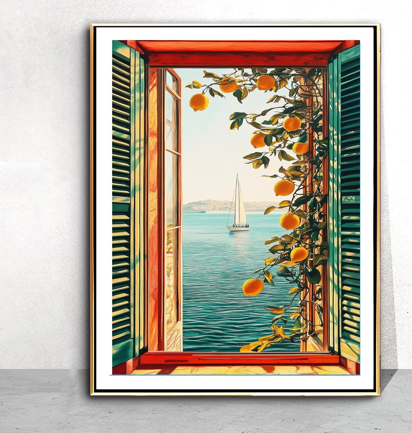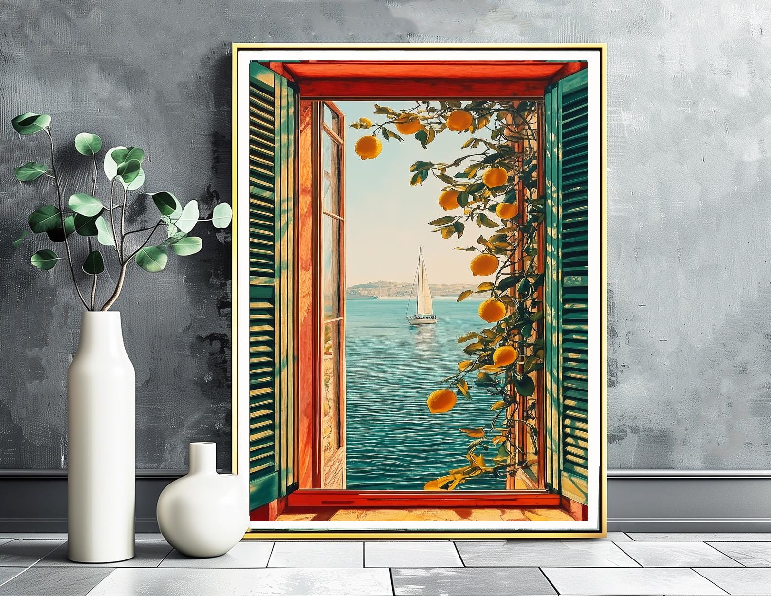 Mediterranean Window View Art Print: Coastal Landscape Wall Decor