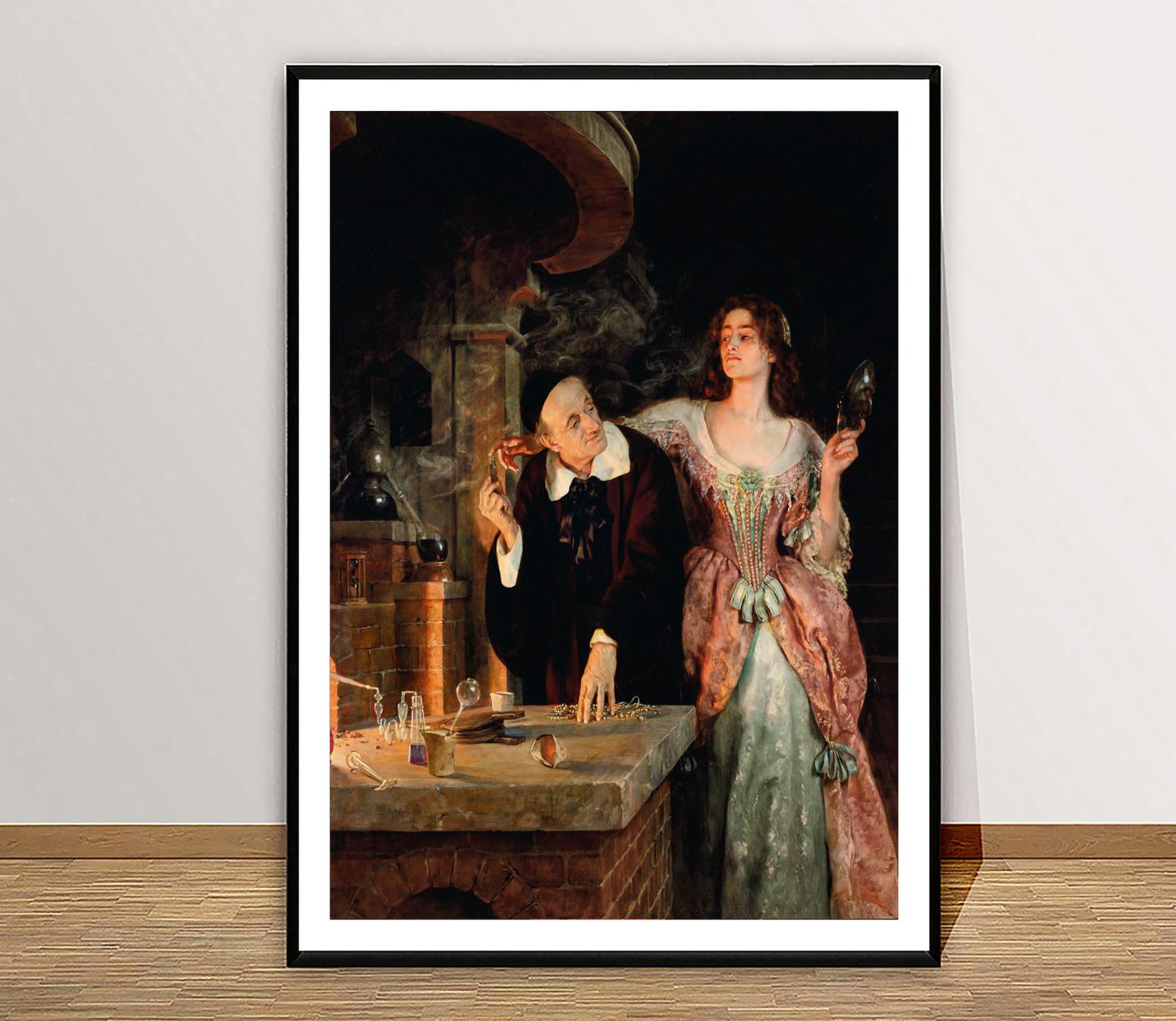 The painting depicts a young woman in an elegant gown watching an alchemist prepare poison—her expression poised and resolute. The scene is thick with psychological tension and gothic allure.