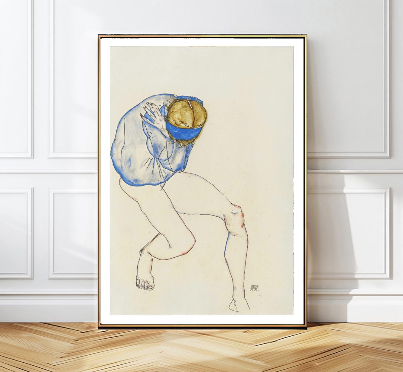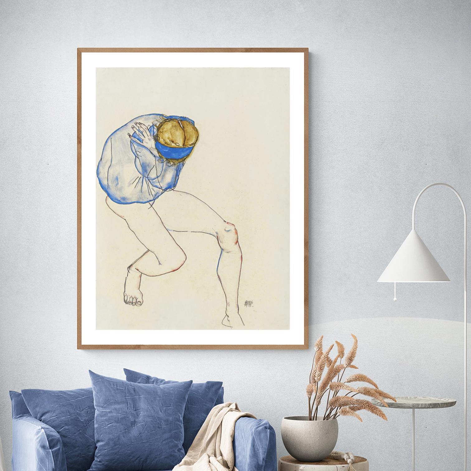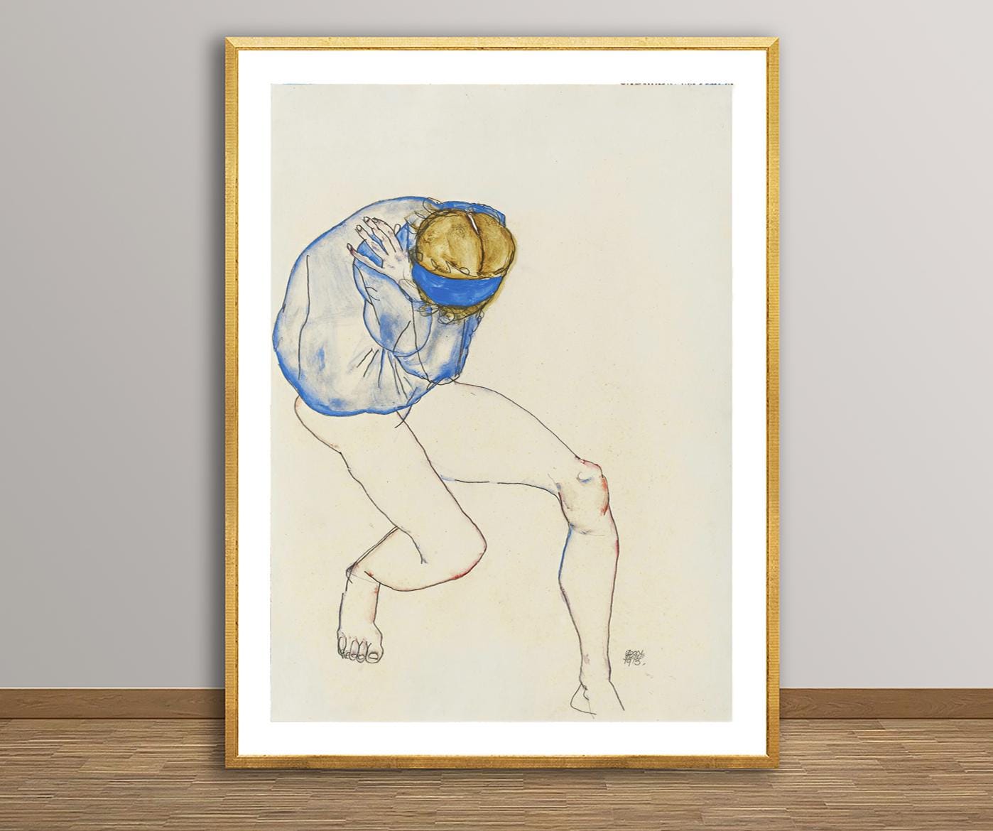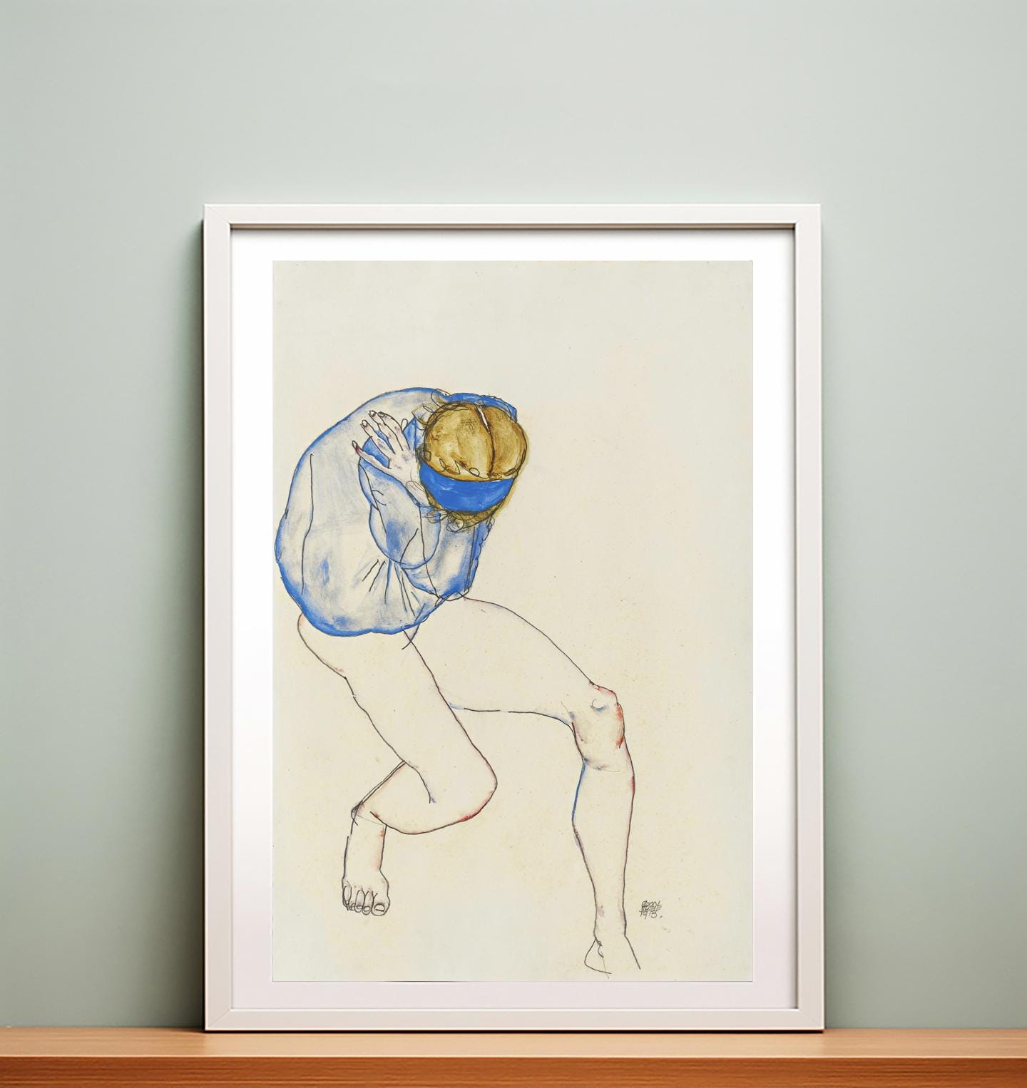 Semi Nude Blond Girl with Blue Shirt and Blue Headband by Egon Schiele by Fine Art Print - Poster Paper or Canvas Print / Gift Idea