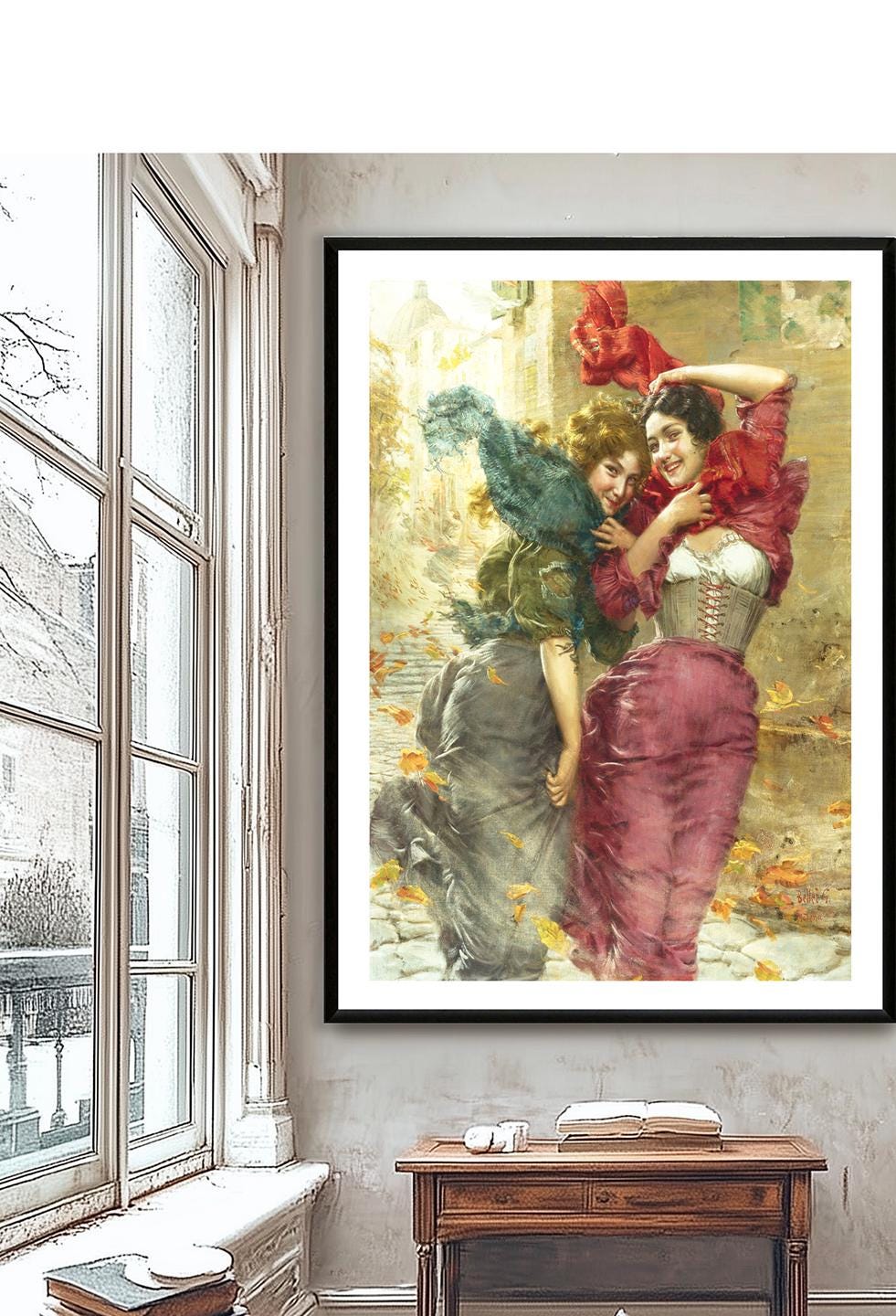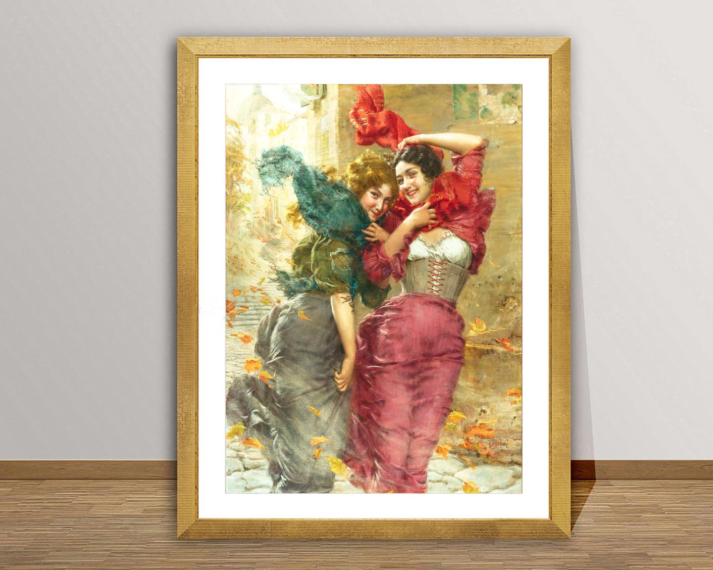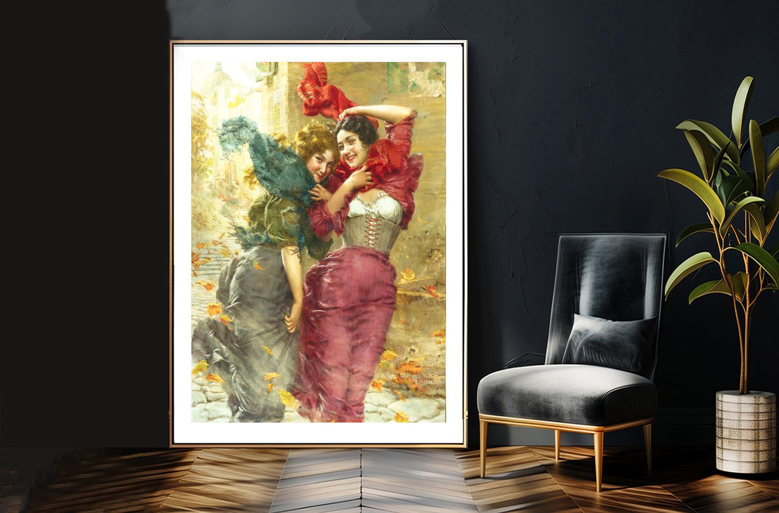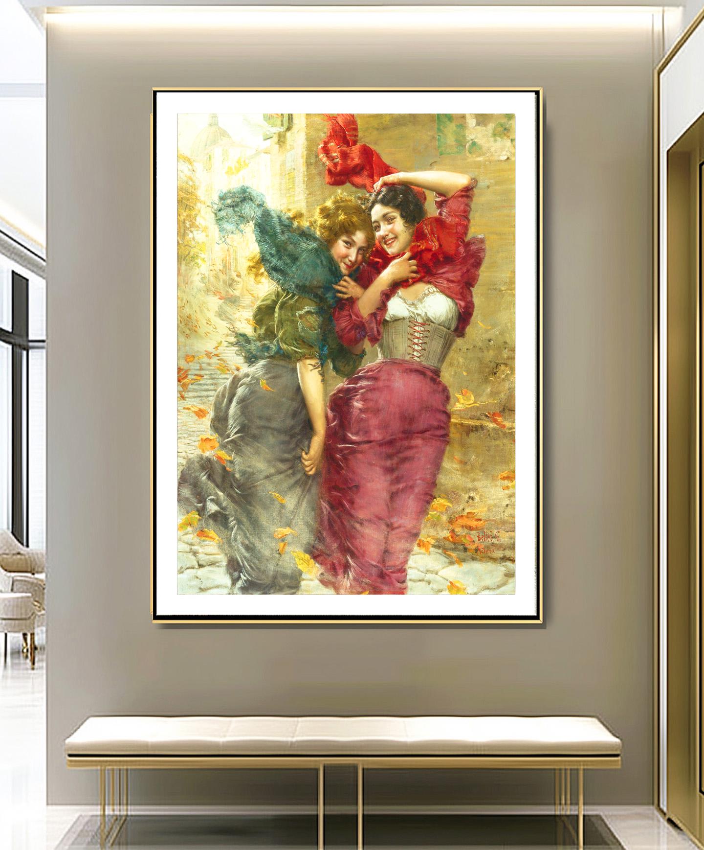 "Windy Day" by Gaetano Bellei is a vibrant and dynamic painting that beautifully captures movement and emotion. The swirling wind animates the scene, lifting the women's garments and scarves, creating a sense of spontaneity and playfulness. The two women, seemingly caught mid-laughter, exude joy and liveliness, making the moment feel almost cinematic.