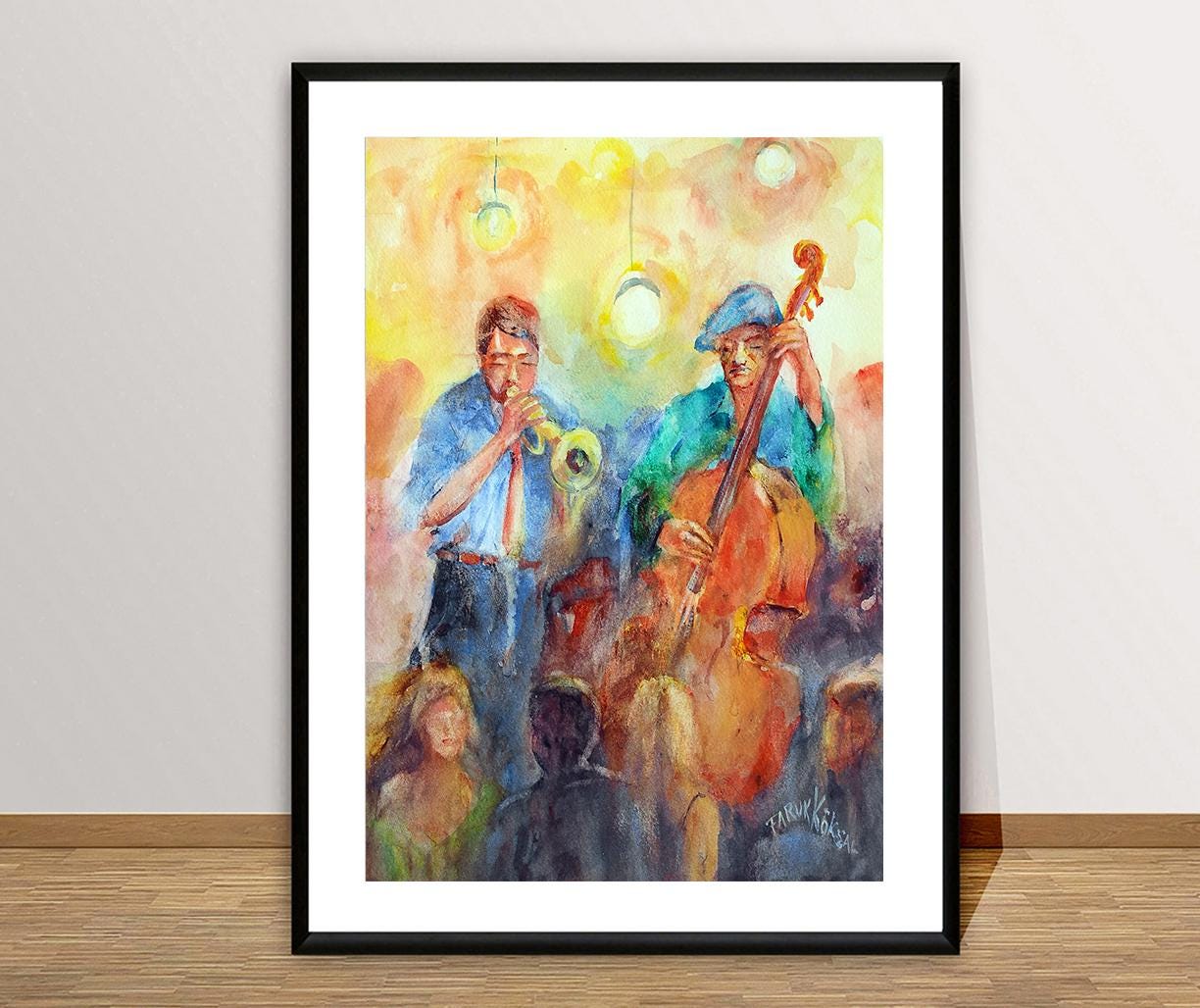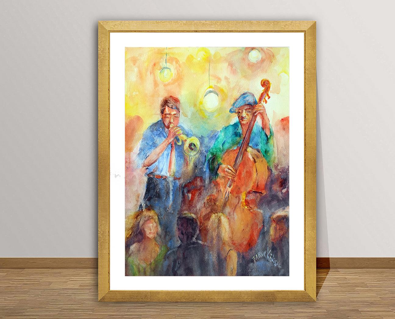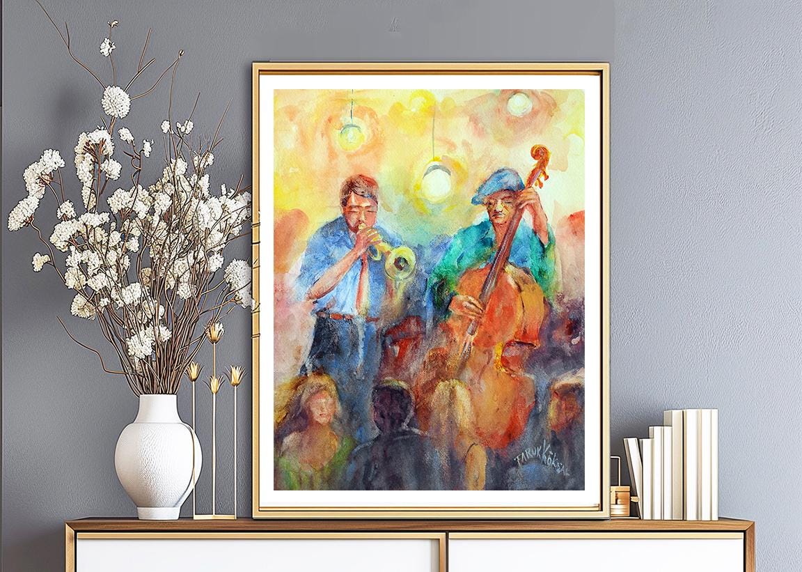 At the Jazz Club Watercolor (Aquarell) Painting by Faruk Koksal - Poster Paper or Canvas Print / Wall Decor