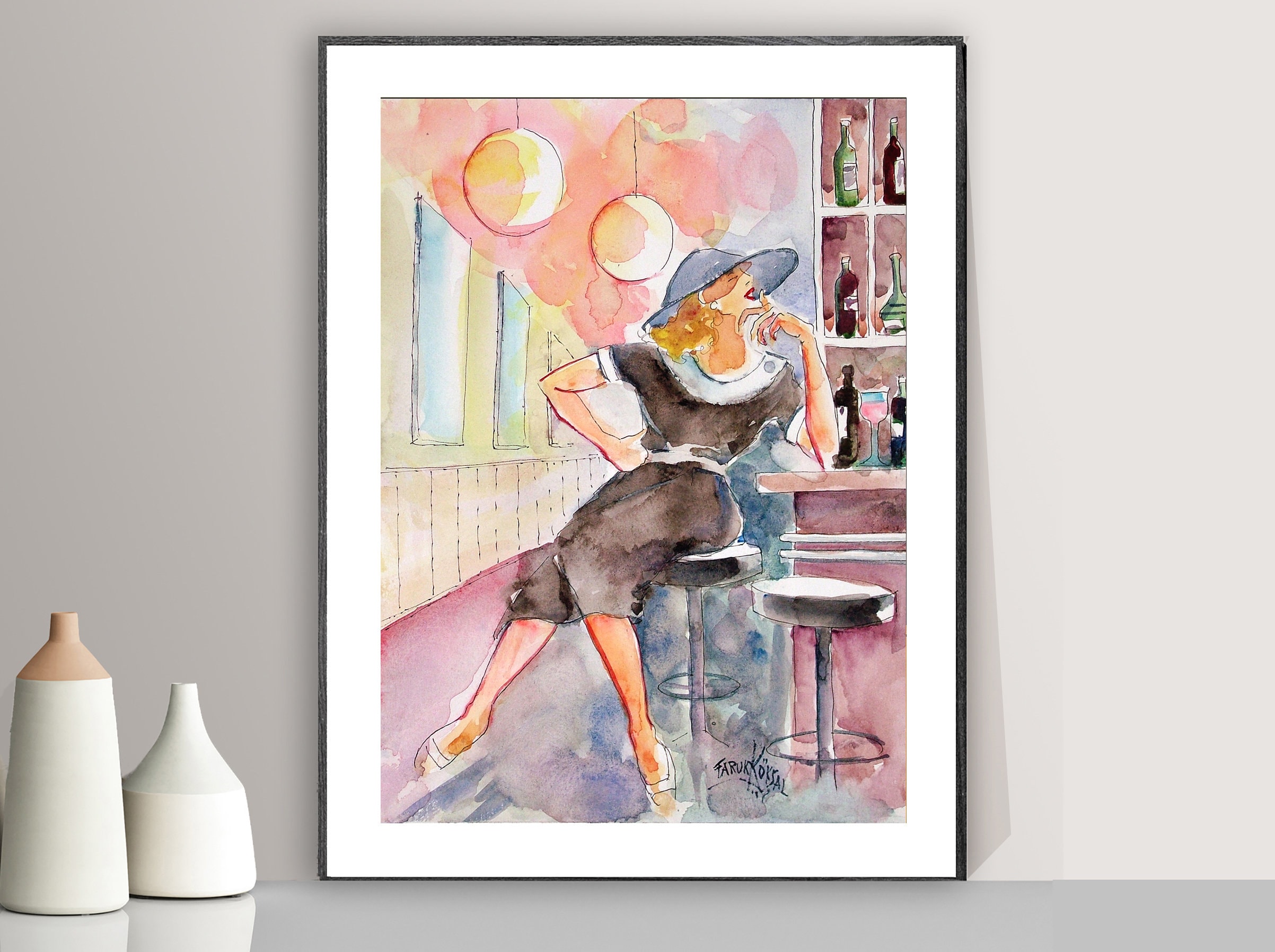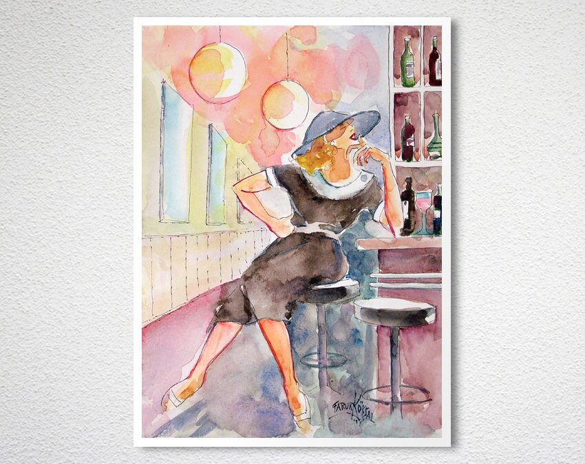 At the Bar Watercolor Painting (Aquarell) by Faruk Koksal- Poster Paper or Canvas Print