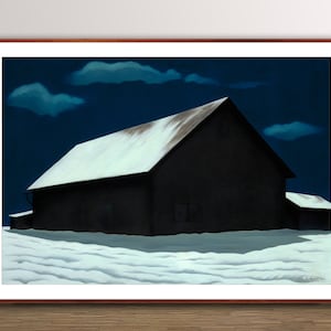 The painting presents a snowy, forested scene, where the muted colors of winter are contrasted by the rich greens of foliage and the soft textures of snow. While the scene is peaceful, there's also a certain surreal quality to it, with the towering trees and landscape almost feeling as if they are part of a larger, fantastical world.