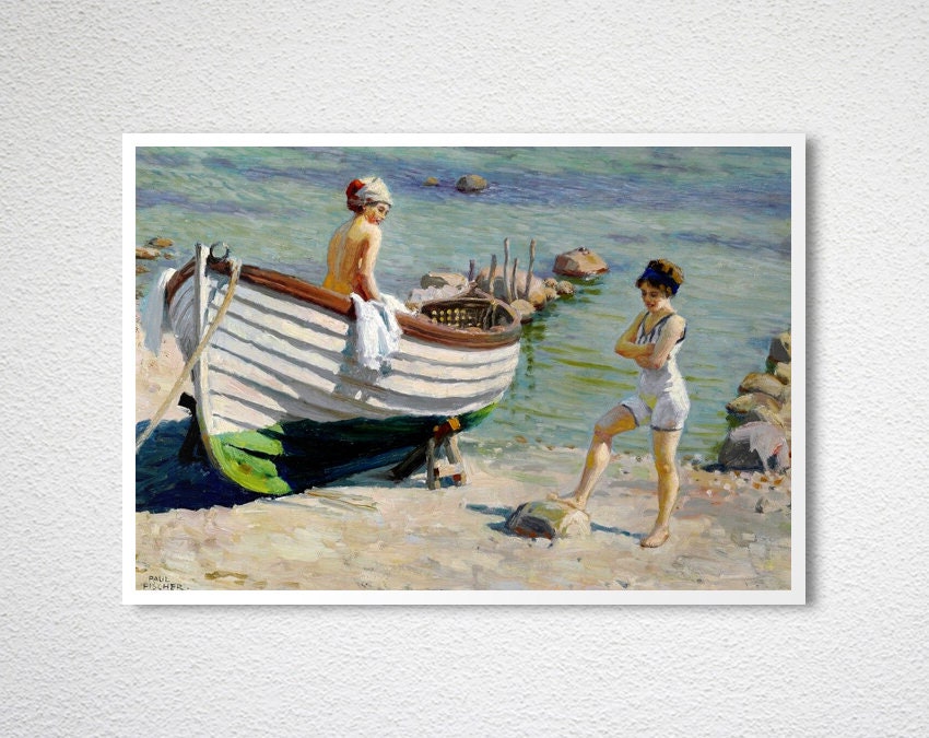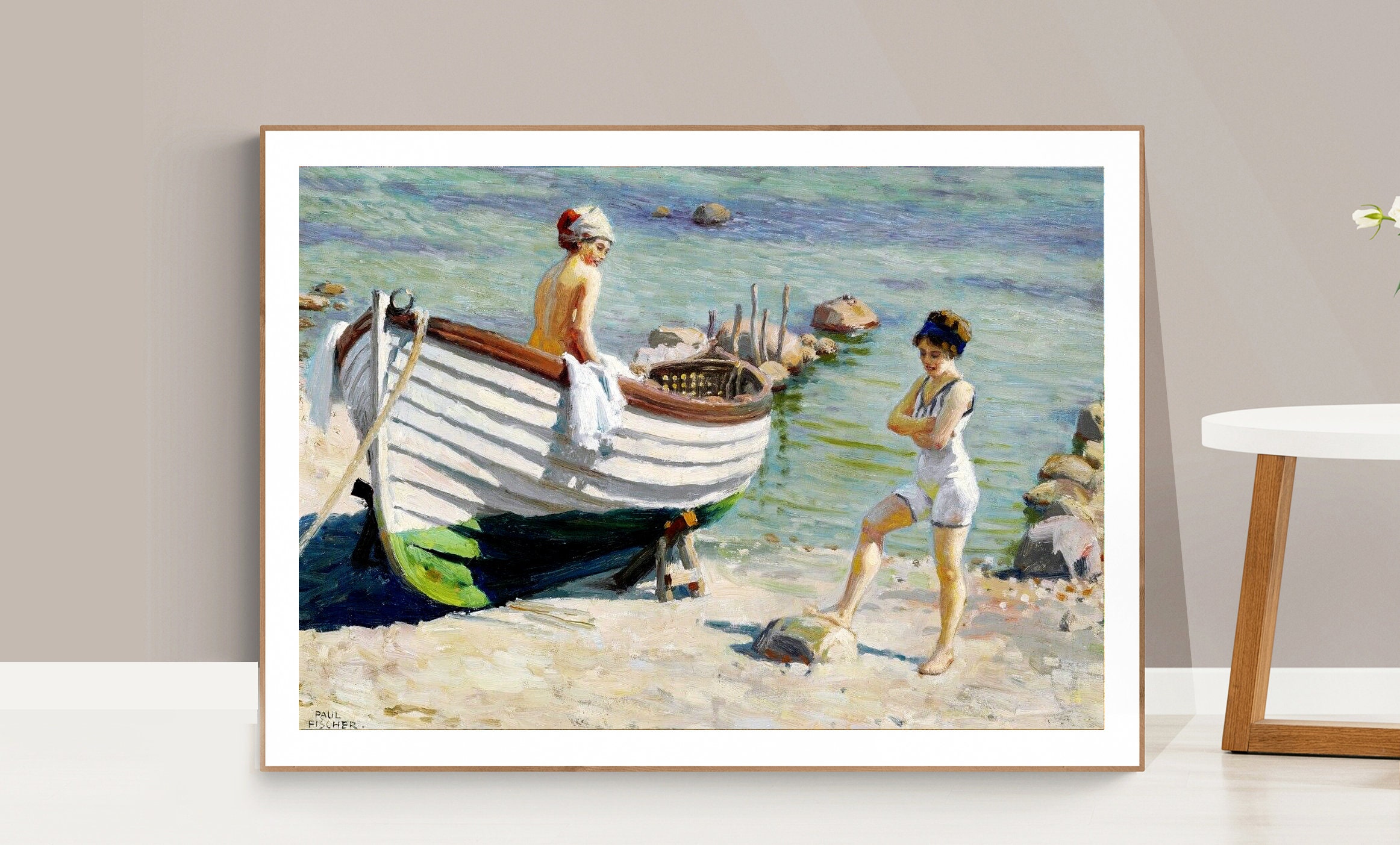 Two Young Women, and a Boat on the Beach by Paul Fischer, Fine Art Print - Summer Time Poster, Boat Artwork, Seascape Wall Art