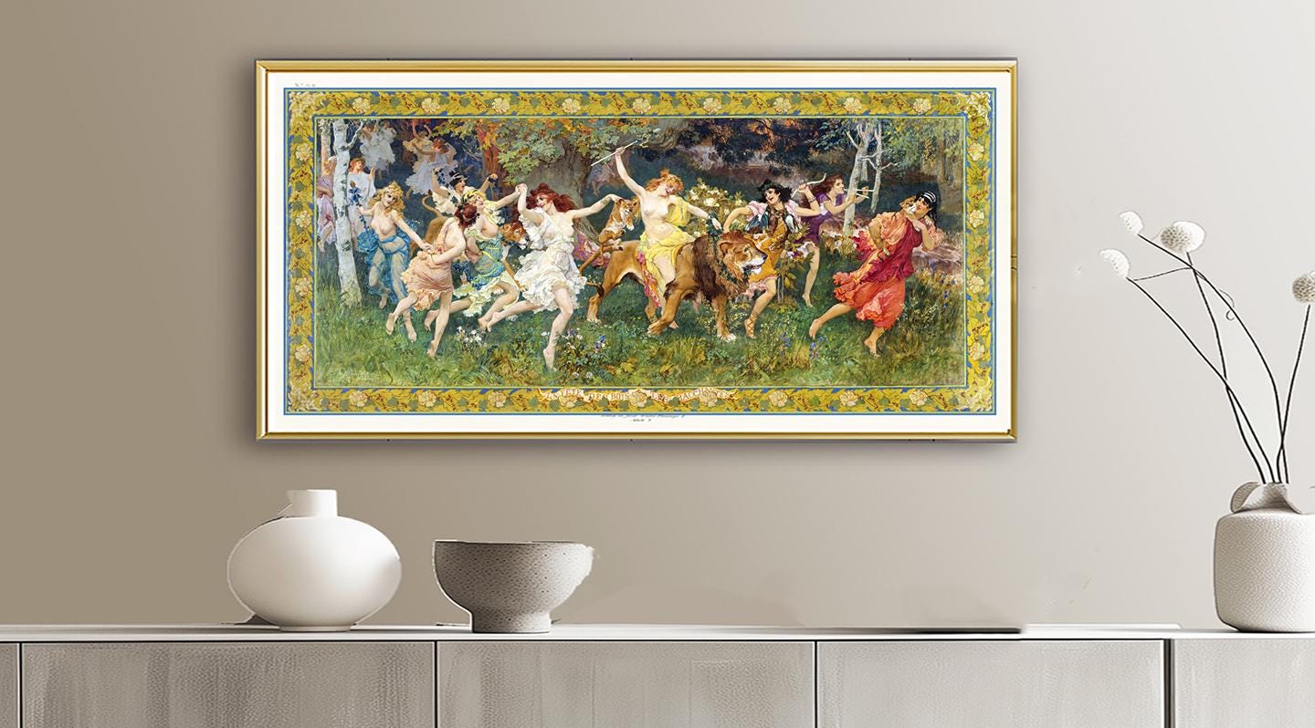 Frederick Arthur Bridgman’s La Fête des Bois, Les Bacchantes is a vibrant and dynamic portrayal of a Bacchic celebration set in a lush, wooded landscape. The painting captures the wild, ecstatic energy of the Bacchantes—followers of Bacchus, the god of wine—dancing in a state of frenzied revelry. Bridgman’s use of rich colors and dramatic lighting enhances the sense of movement and passion, while the intricate details of flowing garments and expressive figures bring the scene to life.