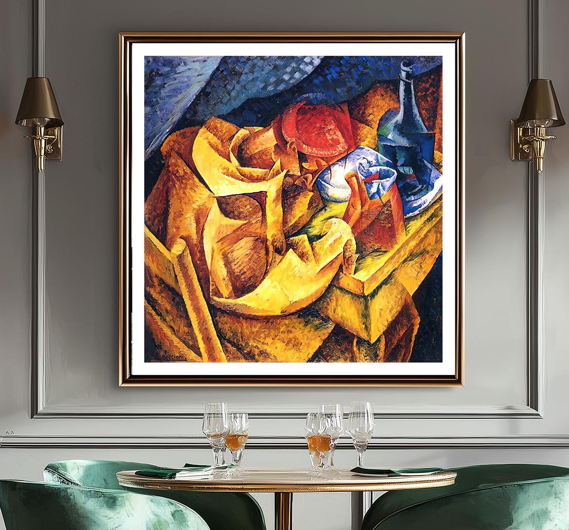 The Drinker is an example of Boccioni’s exploration of human figures in motion, using cubist-inspired geometric shapes and vibrant color contrasts.