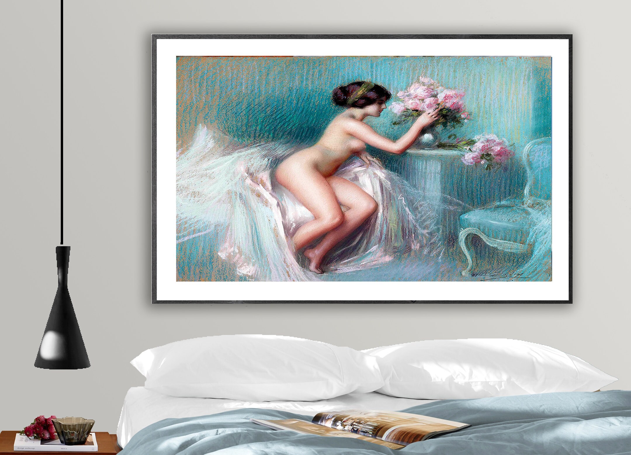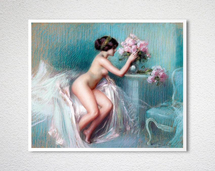 Arranging Summer Blooms by Delphin Enjolras Fine Art Print, Nude Artwork, Figurative Poster, Romantic Décor, Women Poster, Flowers Print