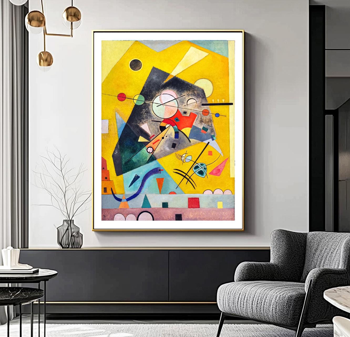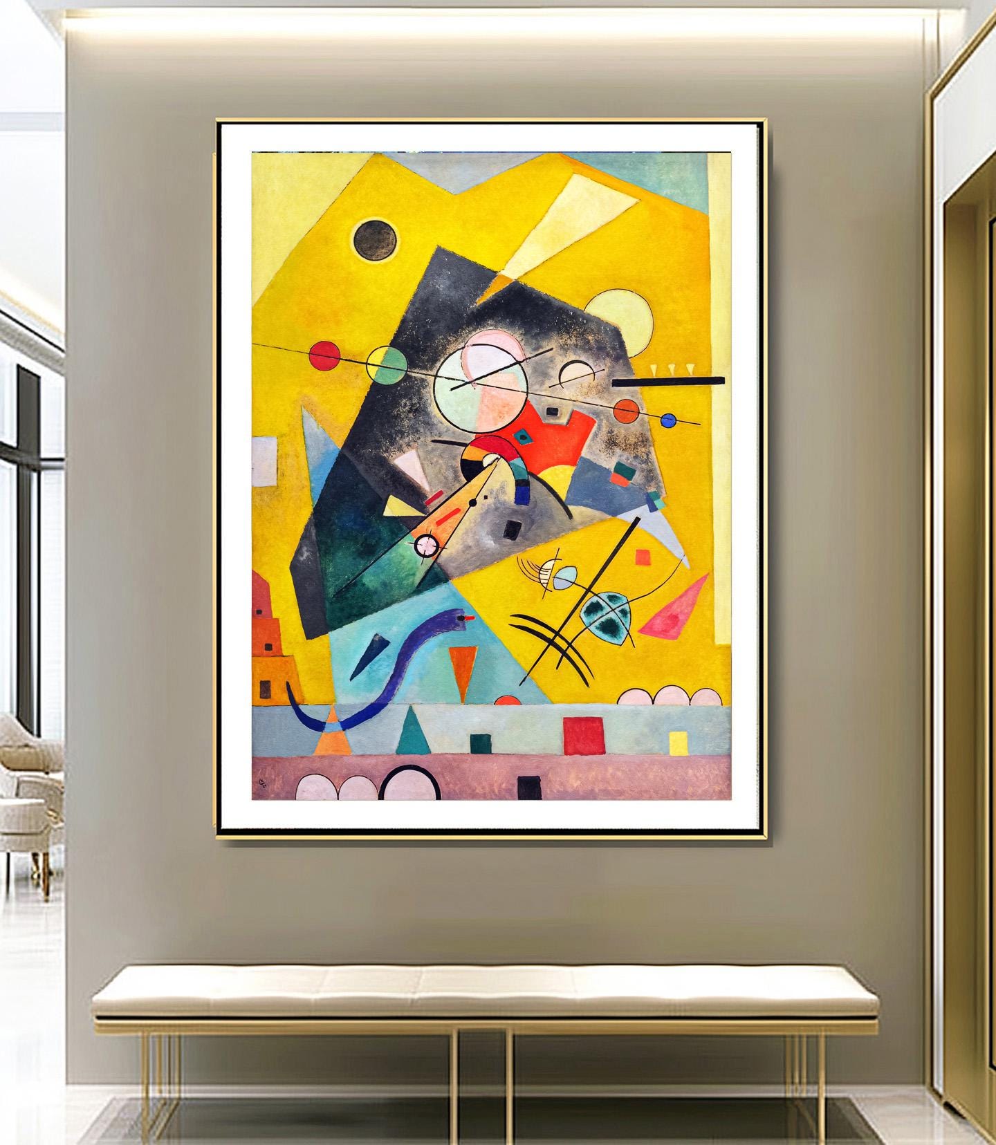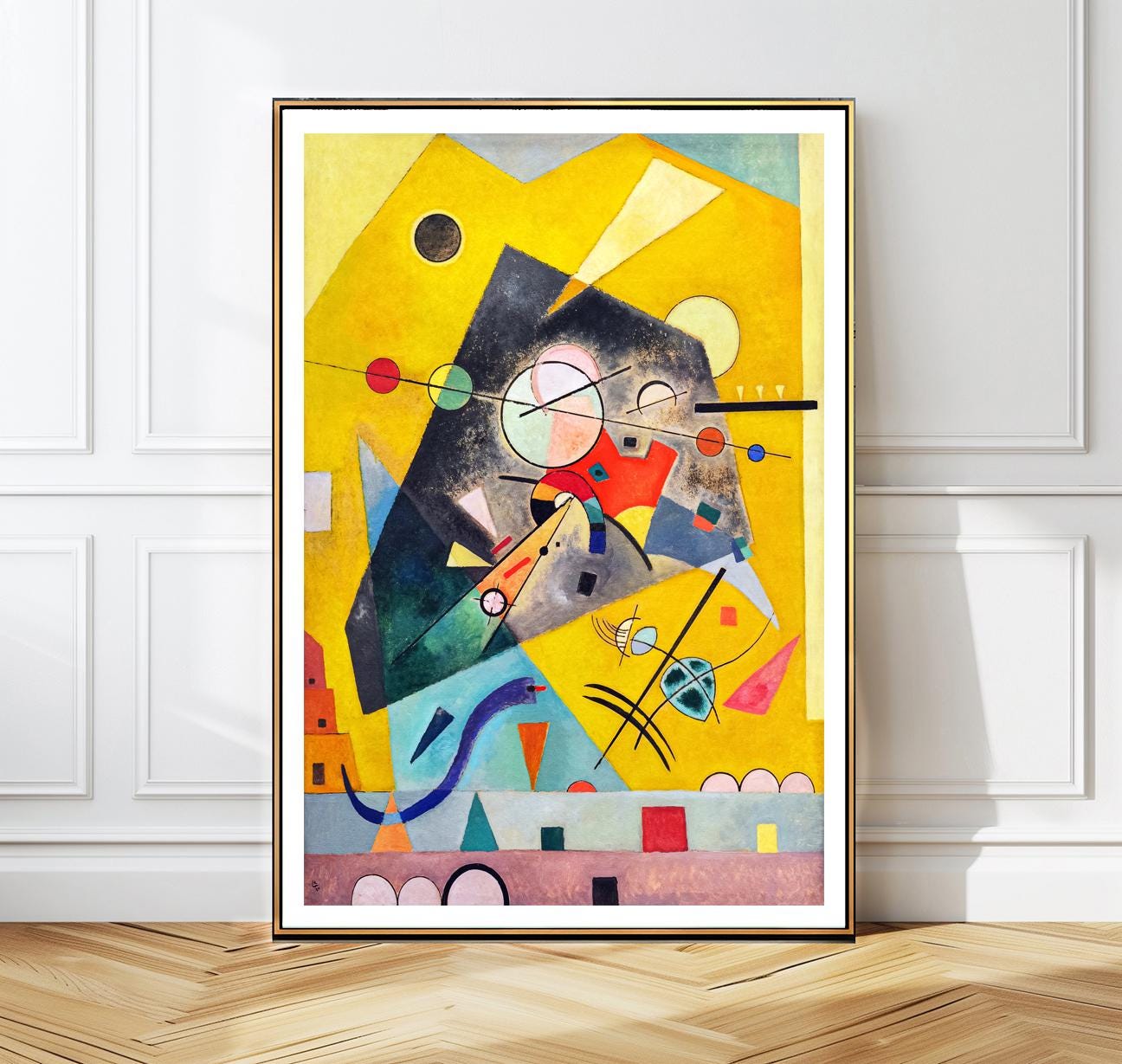 A luminous composition of geometric forms, Harmonie Tranquille reflects Kandinsky’s mature Bauhaus period. The painting features a vibrant yellow background punctuated by floating shapes—circles, arcs, and rectangles in red, blue, black, and green—arranged with rhythmic precision. Despite the dynamic interplay of color and form, the work evokes a sense of calm and balance, true to its title.