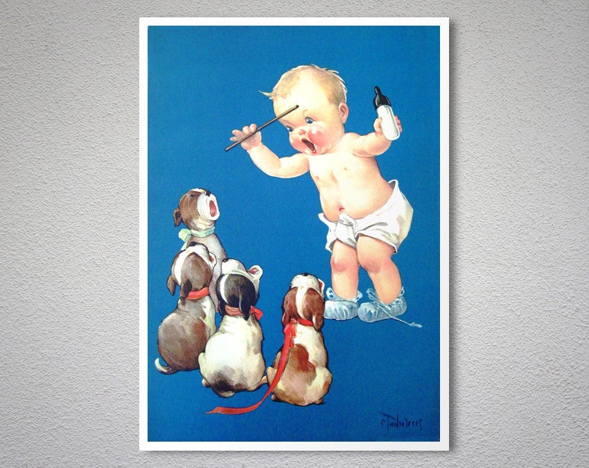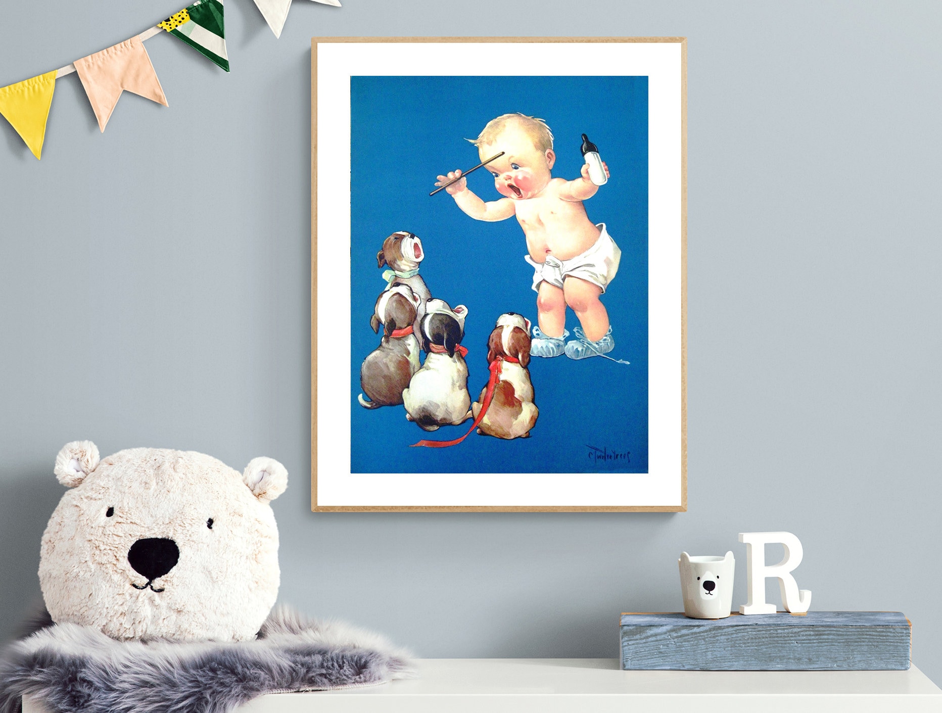 Charles Twelvetrees Art Print: Baby with Puppies, Nursery Decor