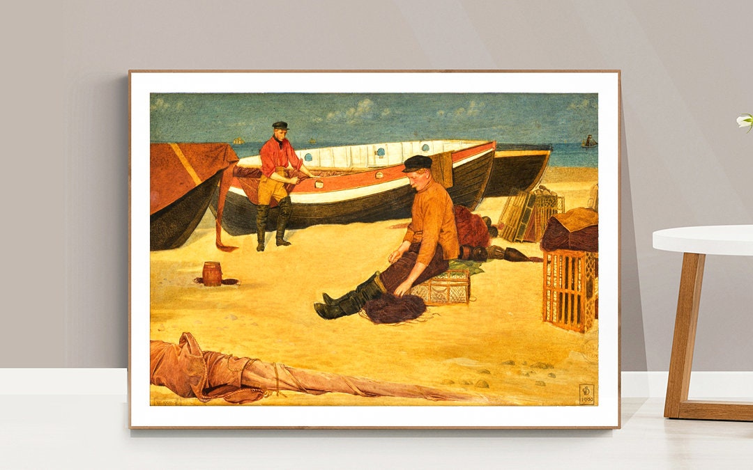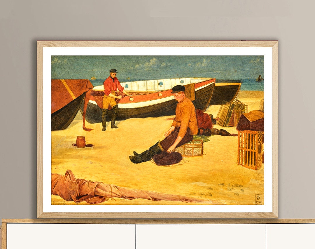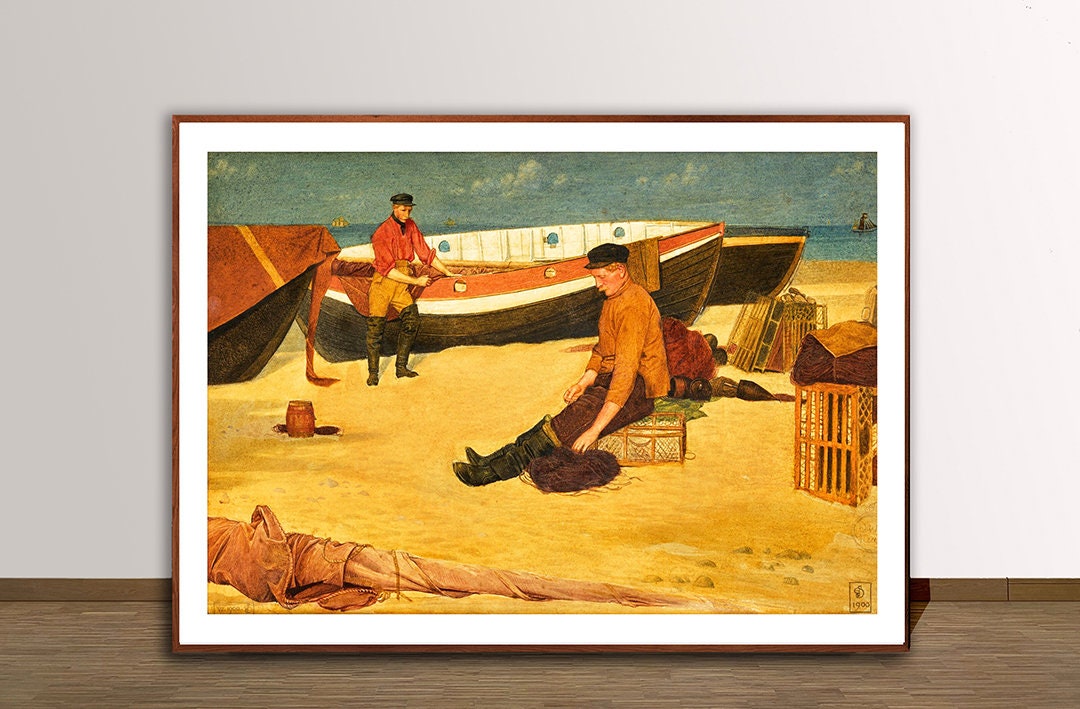 Joseph Edward Southall Art Print: Fishermen on Beach, Fine Art Reproduction