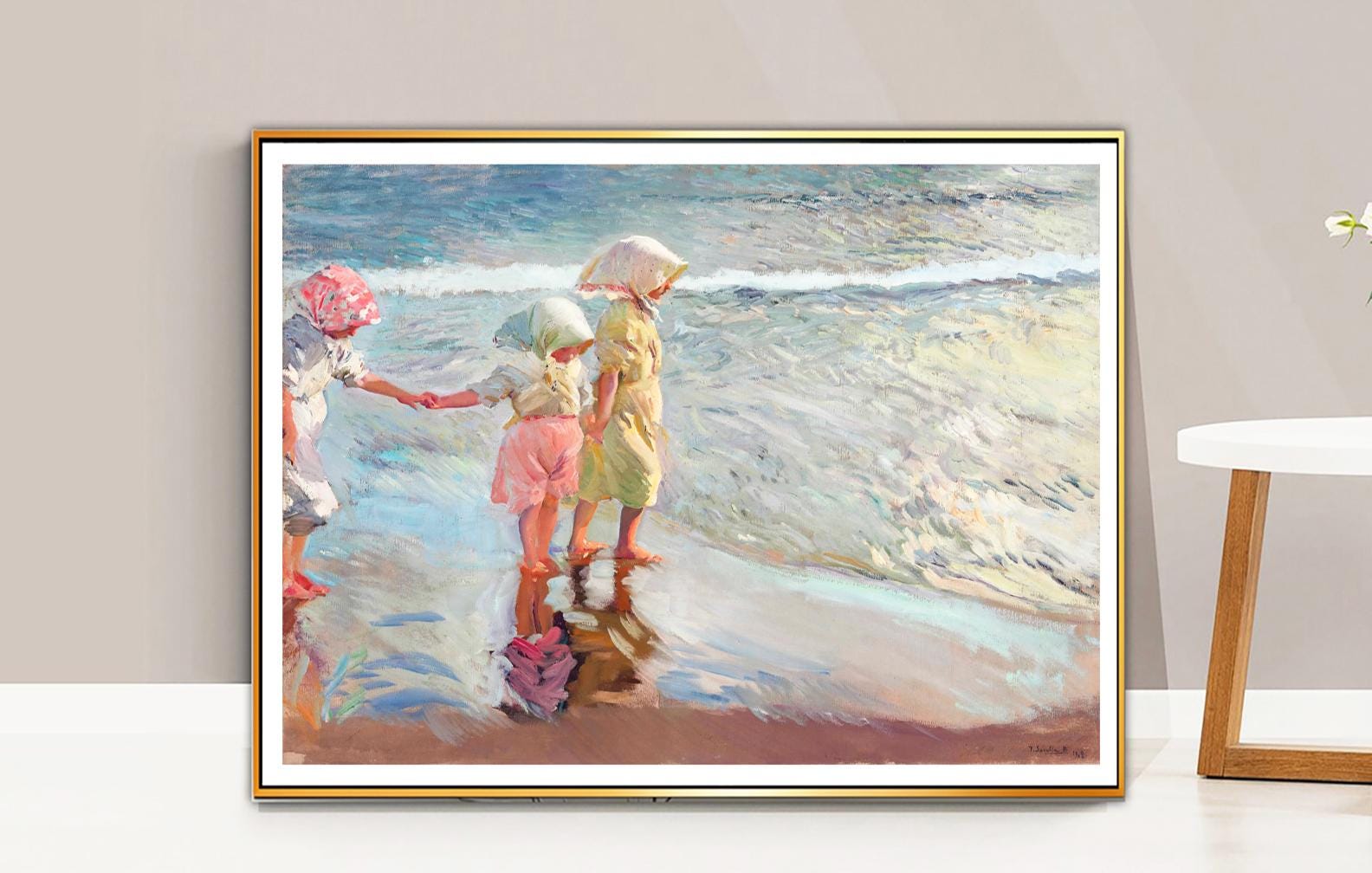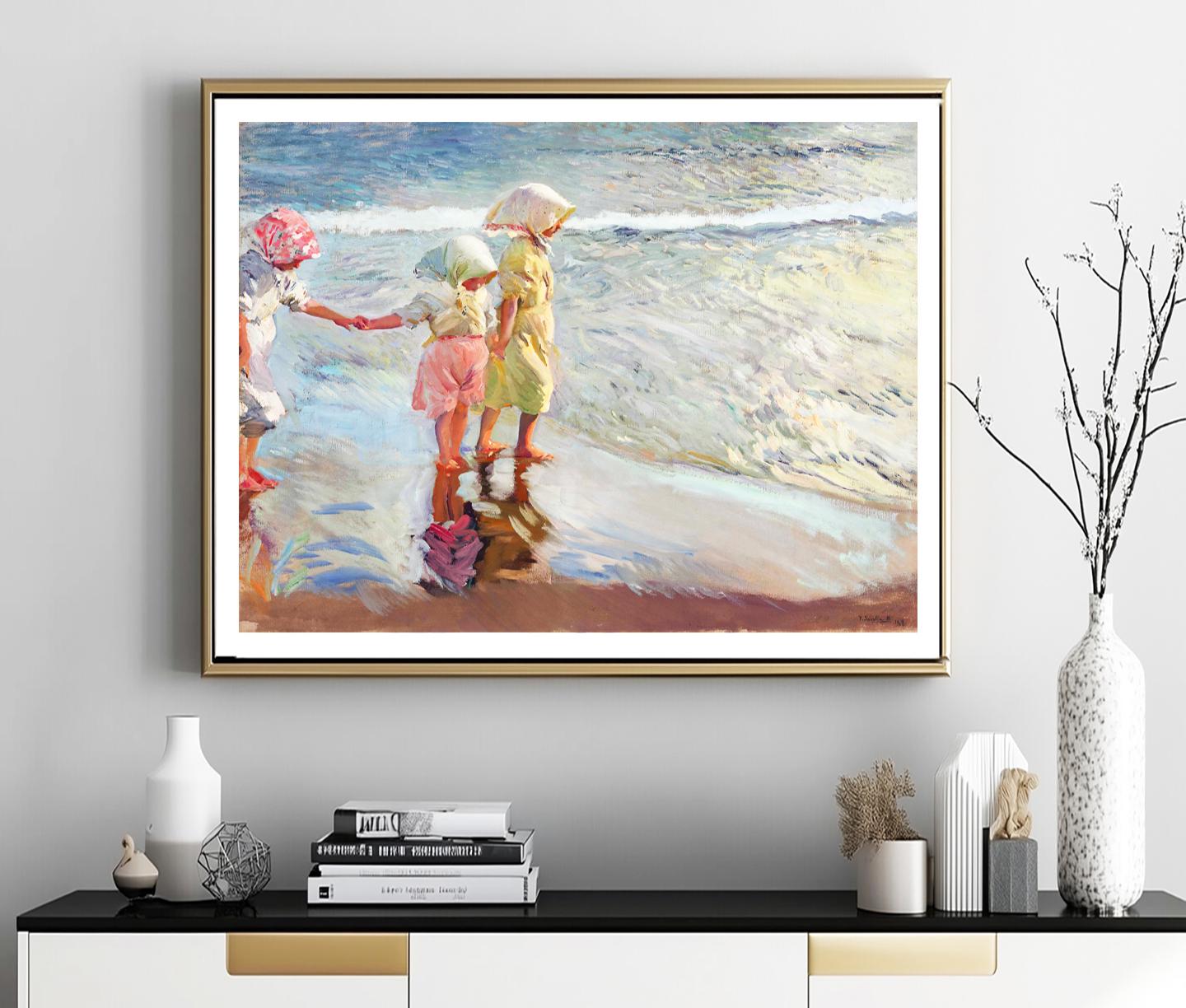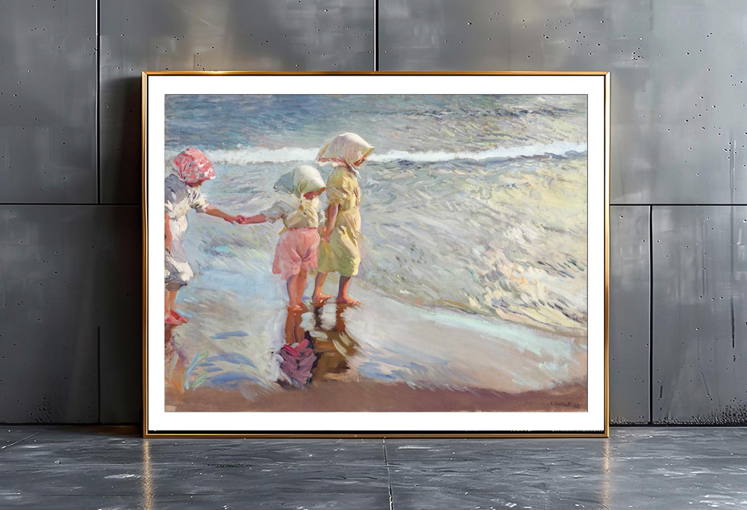 Sorolla’s brushwork captures the shimmer of wet sand, the frothy waves, and the playful spontaneity of the girls. With no horizon line, the composition feels intimate and immediate—like a fleeting moment caught in time.