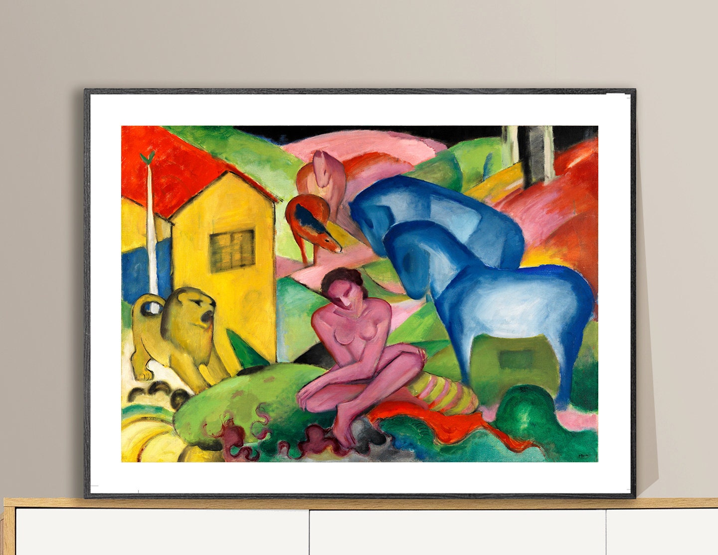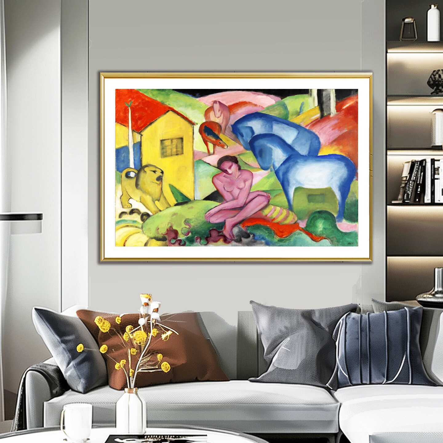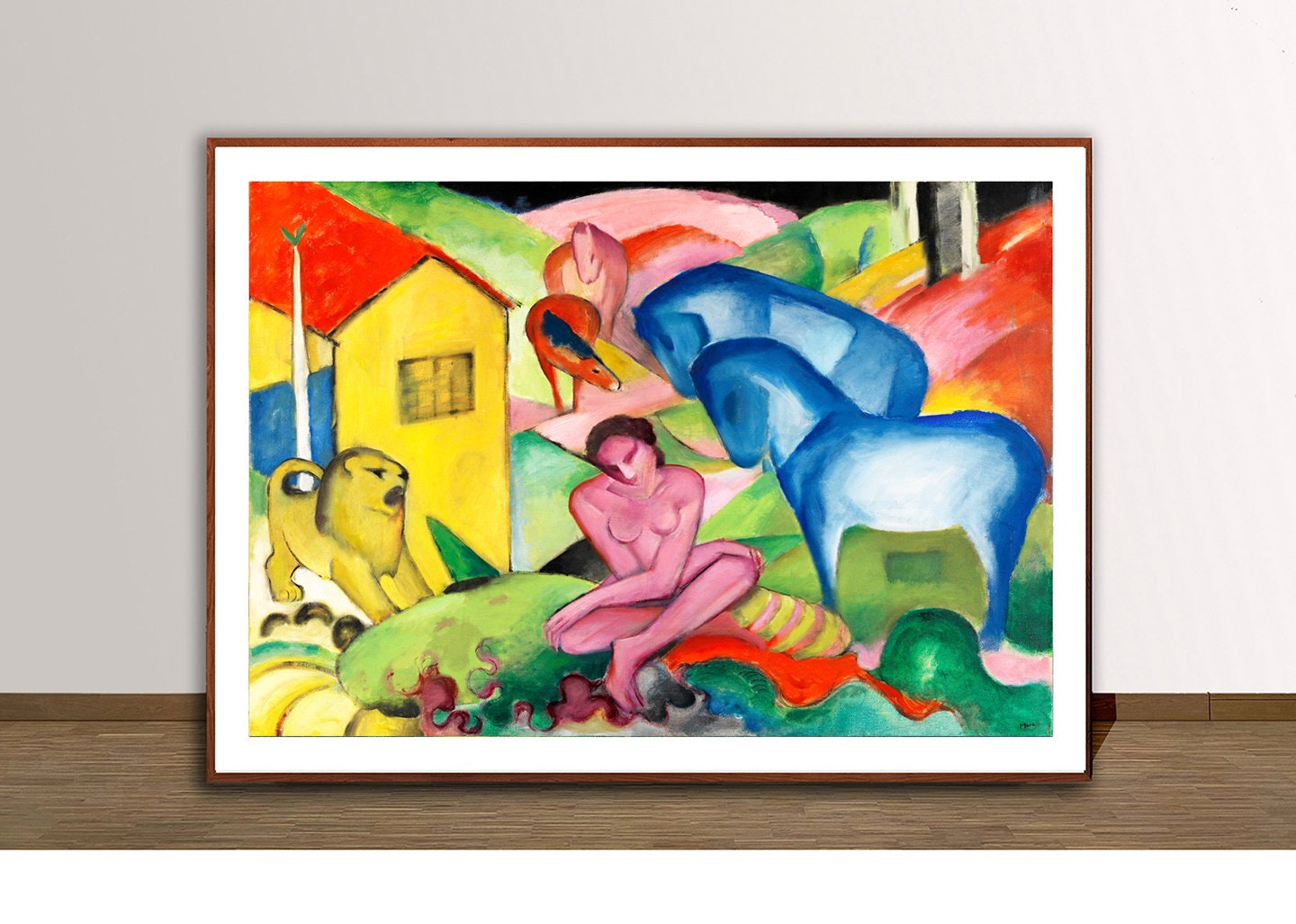Printed on high quality paper, cotton canvas or adhesive sticker paper. A high quality reproduction of painting by Franz Marc. Professional packaging for safe shipping. Natural white border will be added to the image for mounting and framing.