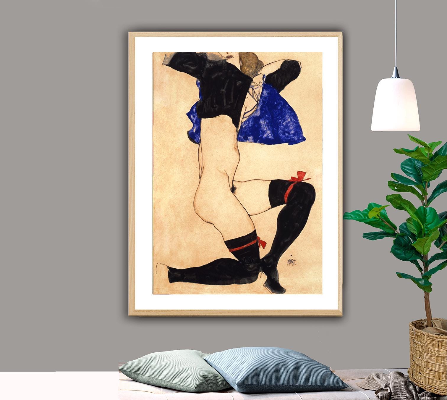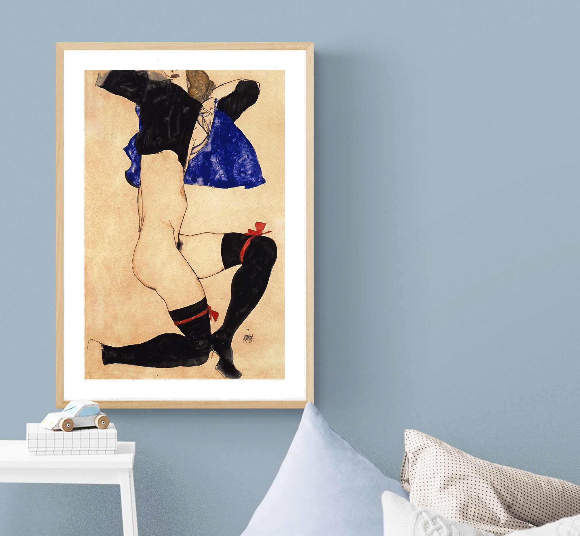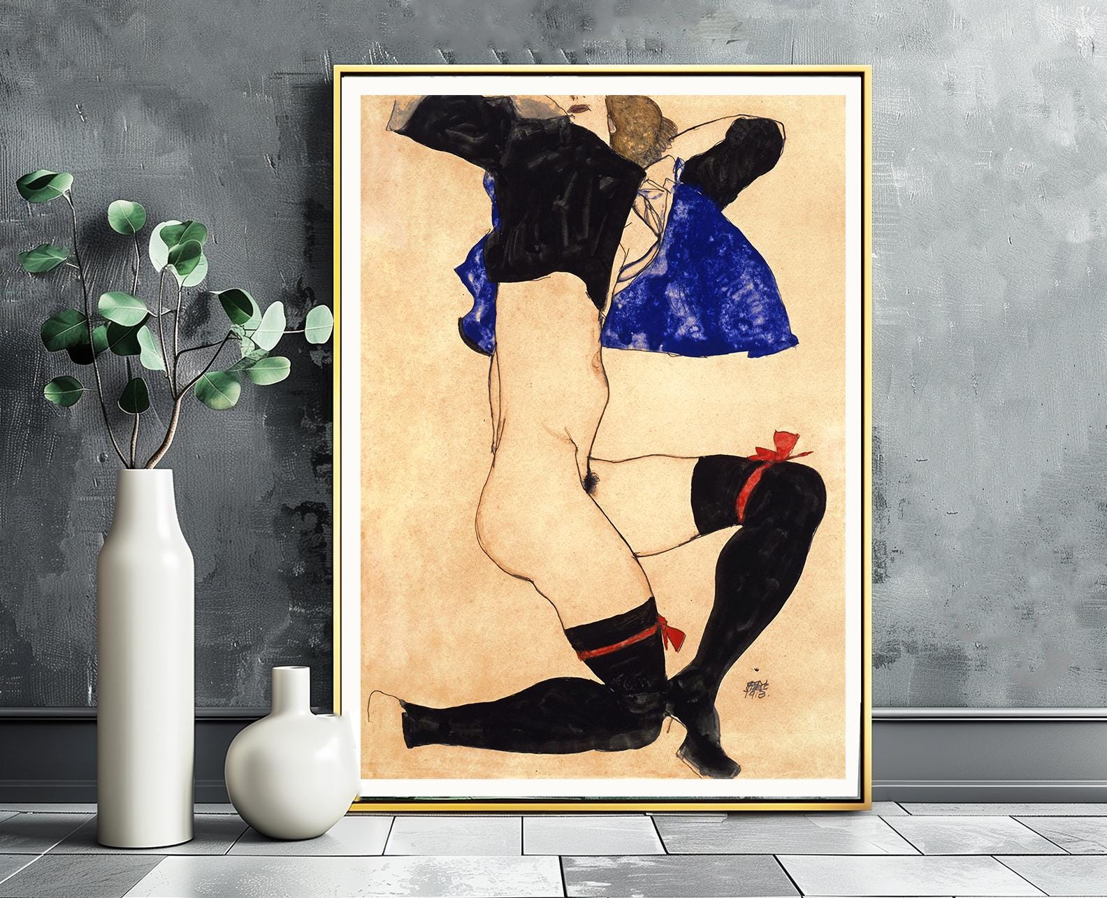 Semi Nude in Black Stockings with Blue Jacket by Egon Schiele by Fine Art Print - Nude Poster / Gift Idea / Wall Decor