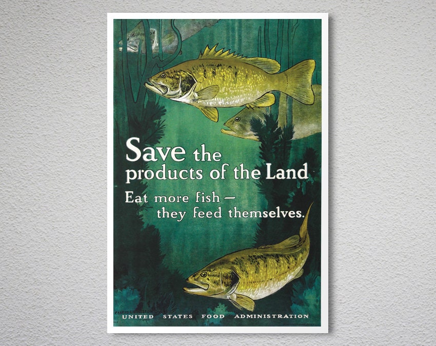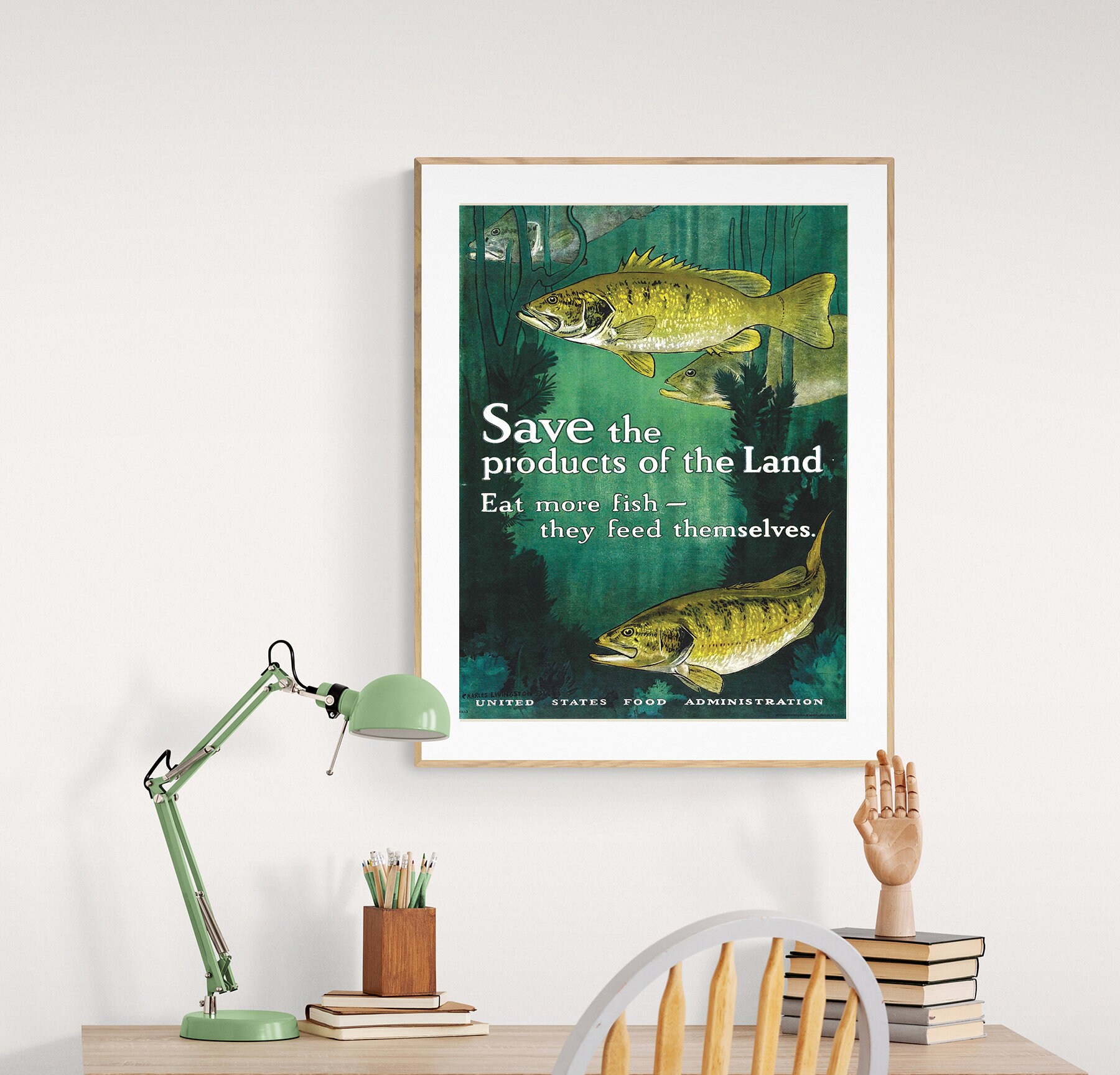 Save the Products of the Land, Eat more Fish Vintage Motivational Poster by Charles Livingston - Poster Paper or Canvas Print / Gift Idea / Wall Decor