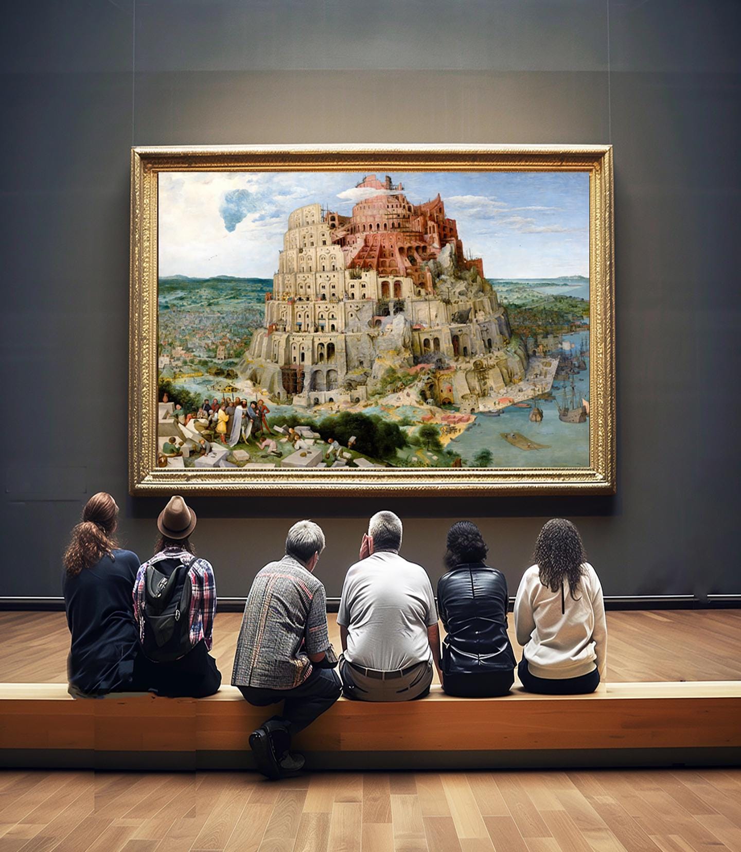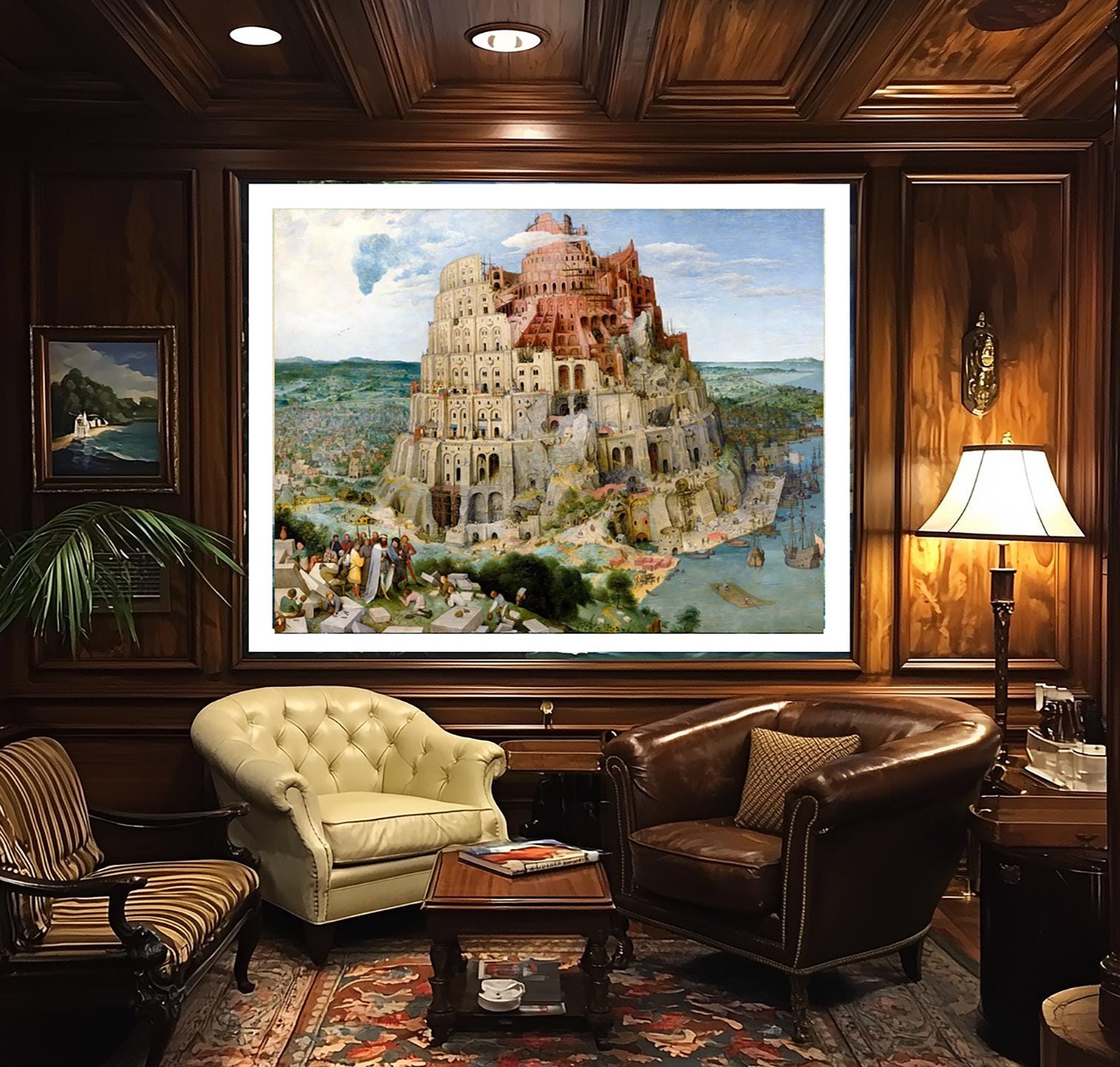 Pieter Bruegel the Elder’s The Tower of Babel is a monumental depiction of human ambition, pride, and inevitable downfall. Based on the biblical story from Genesis, the painting illustrates the construction of a colossal tower meant to reach the heavens—a symbol of humanity’s desire to rival divine power. However, the story ends in chaos, as God confounds their language, leading to the tower’s failure.