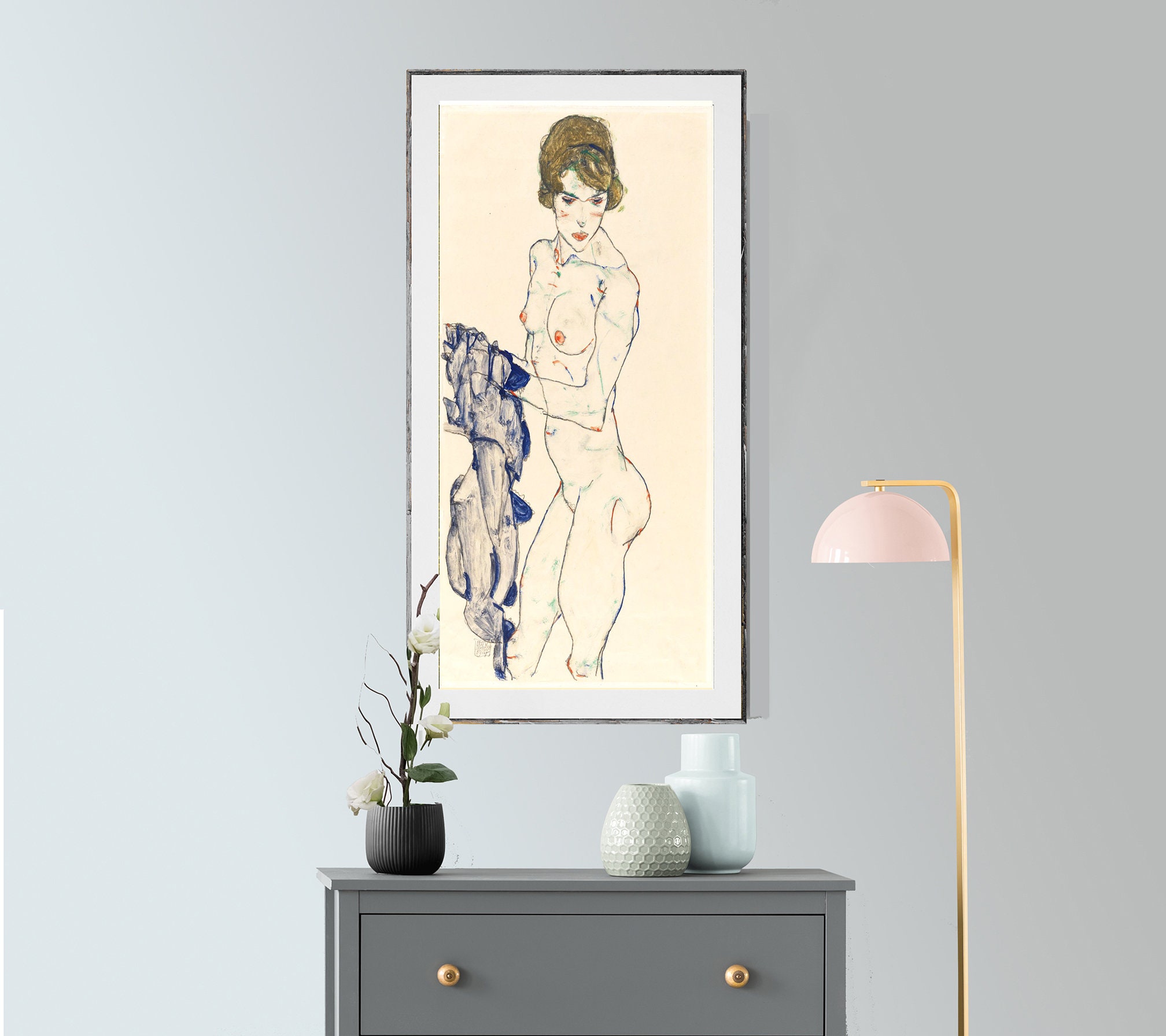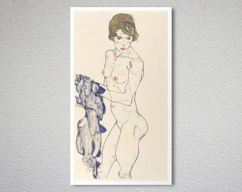 Nude Female Standing in Blue Cloth by Egon Schiele Fine Art Print - Poster Paper or Canvas Print / Gift Idea / Wall Decor