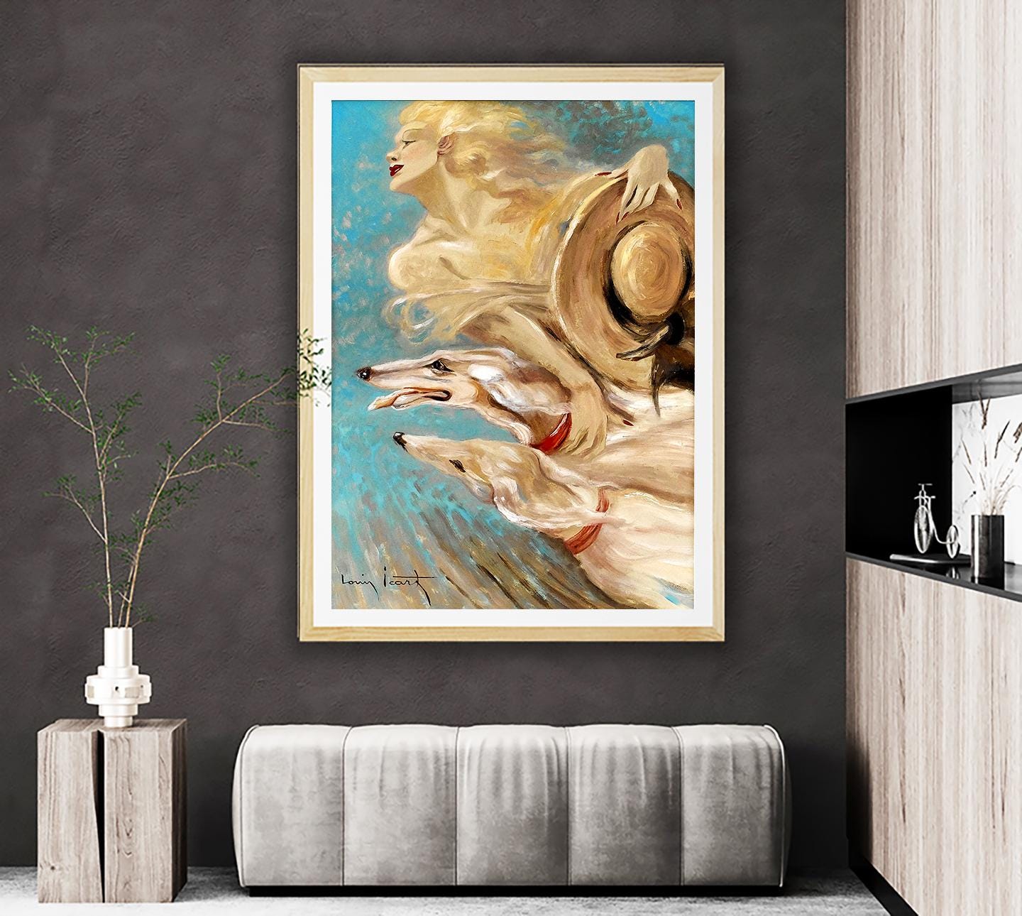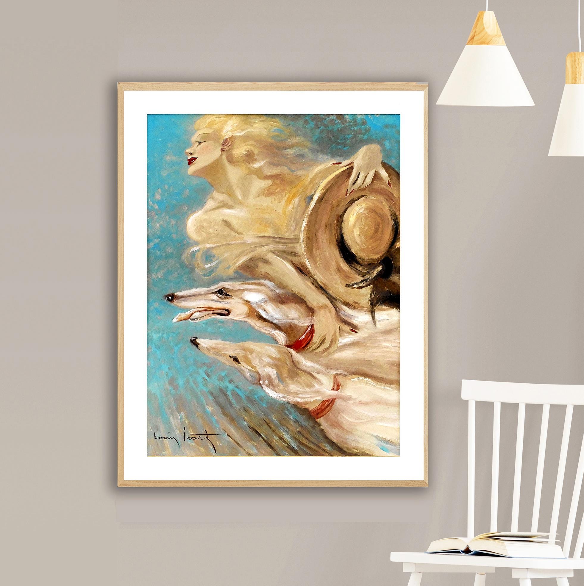 "Élégante aux Deux Lévriers" (Elegant Lady with Two Greyhounds) by Louis Icart is a stunning example of Art Deco elegance and sophistication. Icart, a French artist and illustrator, was renowned for his romantic, glamorous, and fashion-forward portrayals of women, often accompanied by luxurious elements like animals, flowing fabrics, and Parisian scenery.