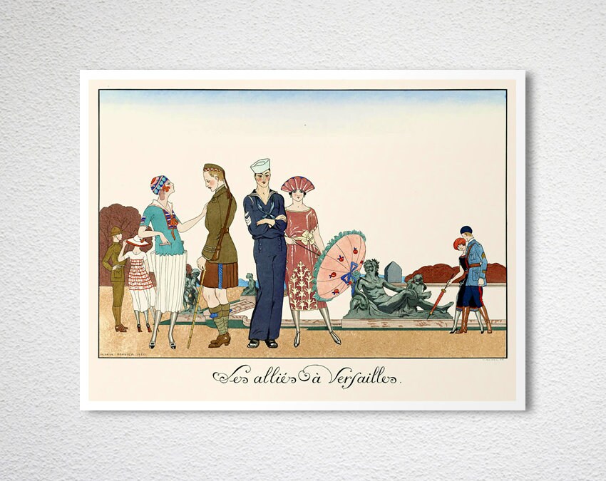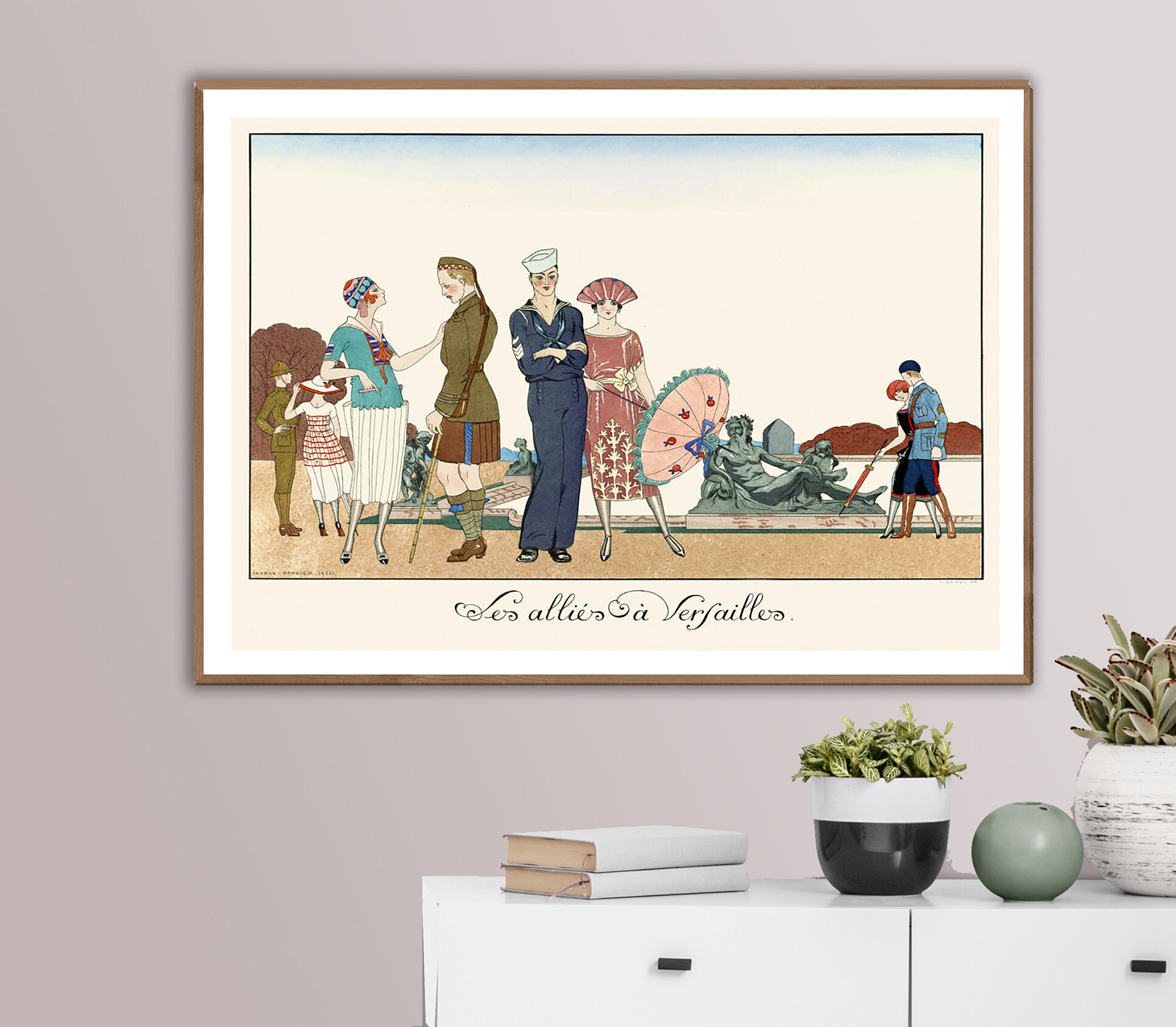 Les Allies a Versailles by George Barbier, Vintage Painting, Illustration Décor, Parisien Fashion Art