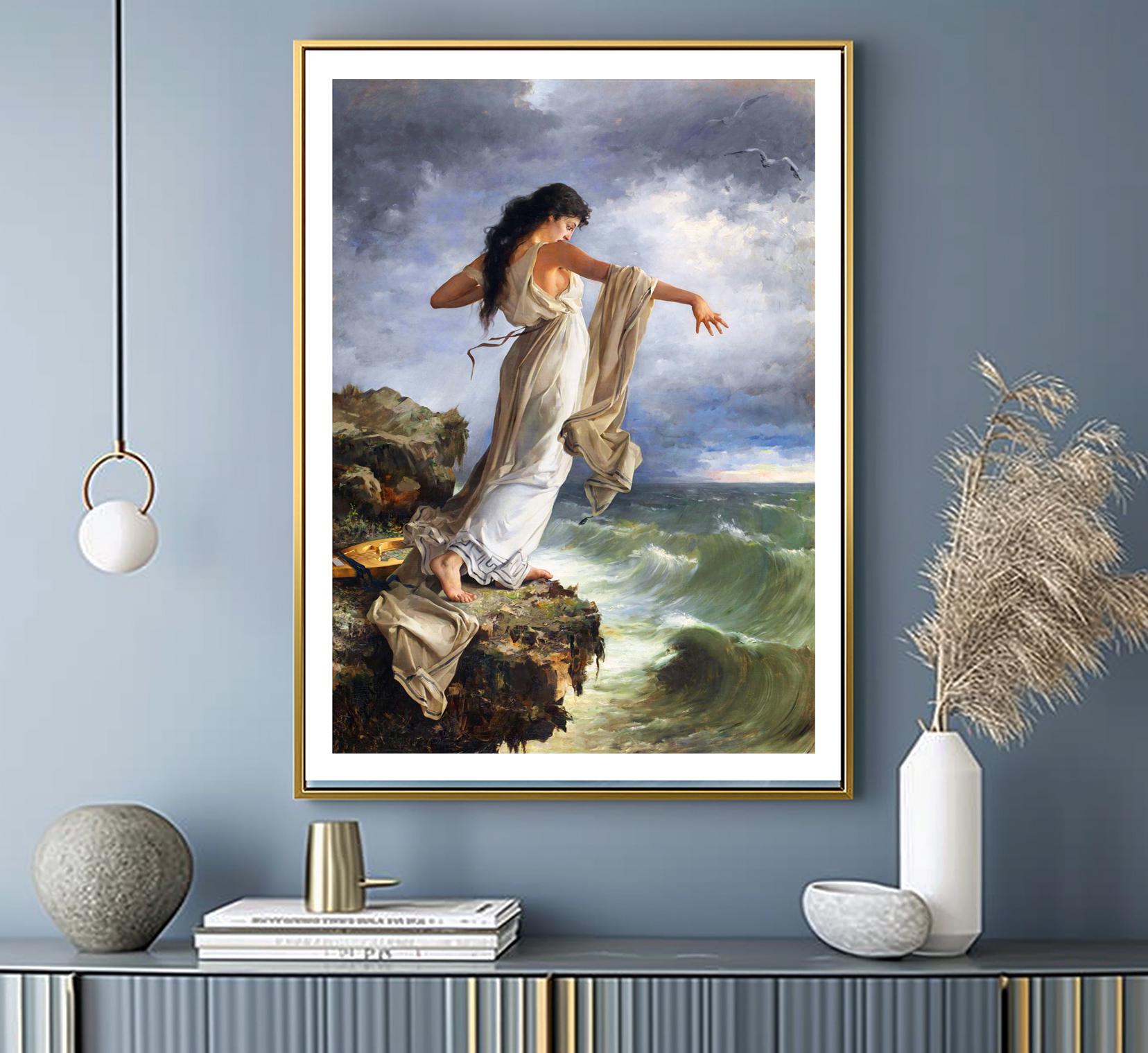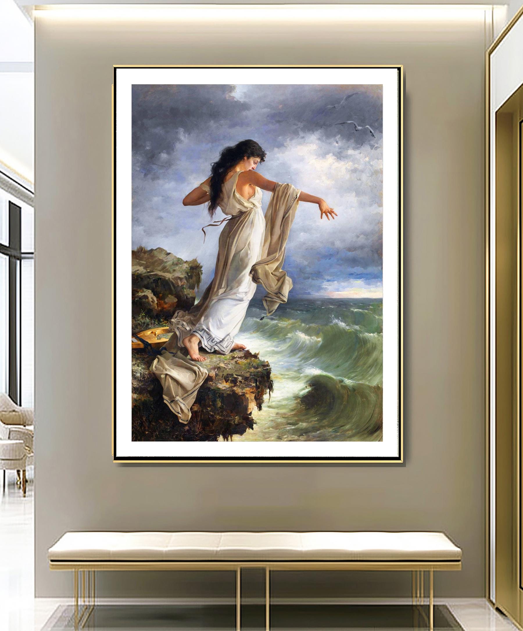 A haunting portrayal of the ancient poet Sappho in her final moments. Set against a dramatic coastal backdrop, the painting captures sorrow, beauty, and the mythic weight of her legend. Selva’s romantic style blends classical form with emotional intensity, evoking themes of longing, exile, and poetic despair.