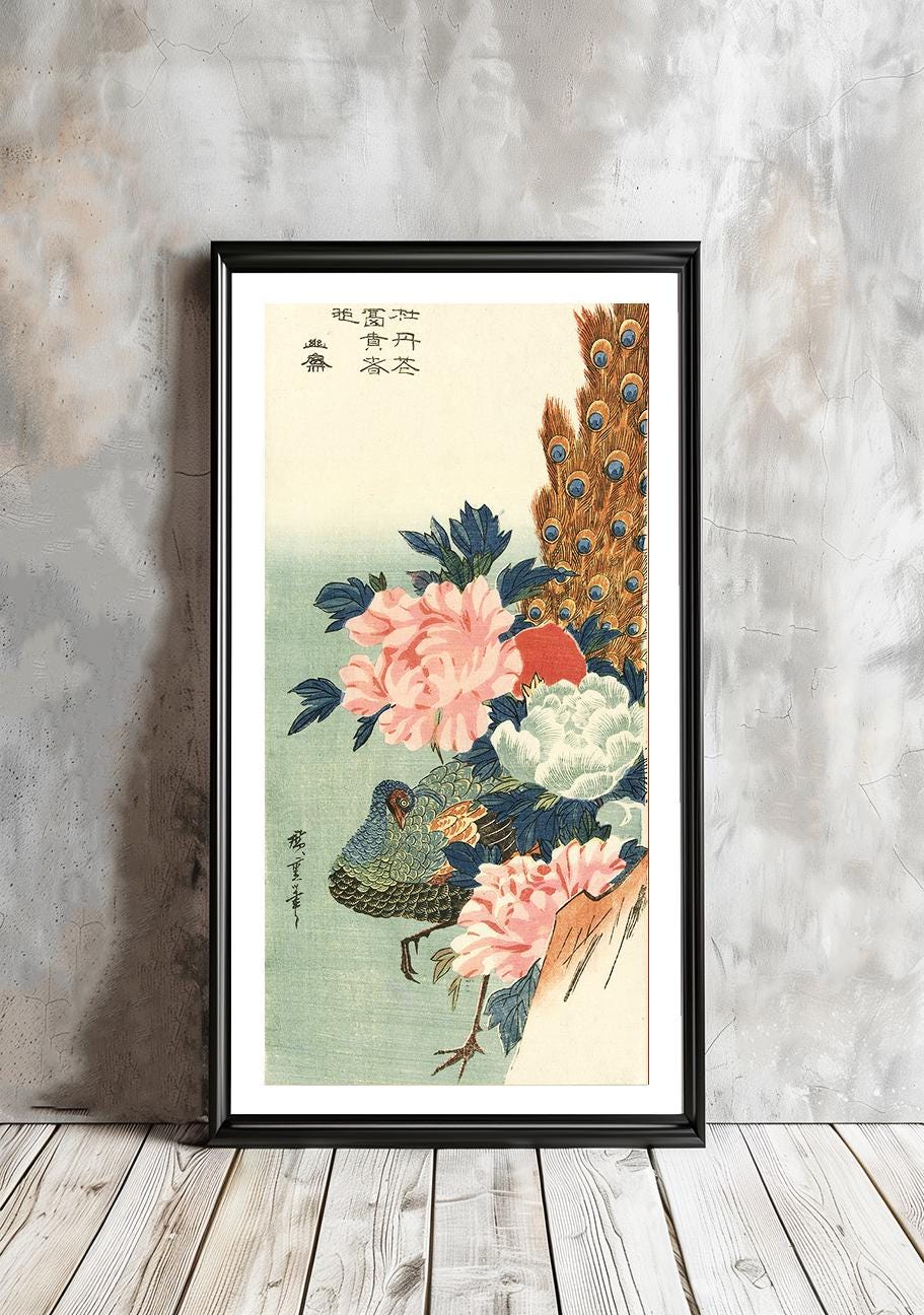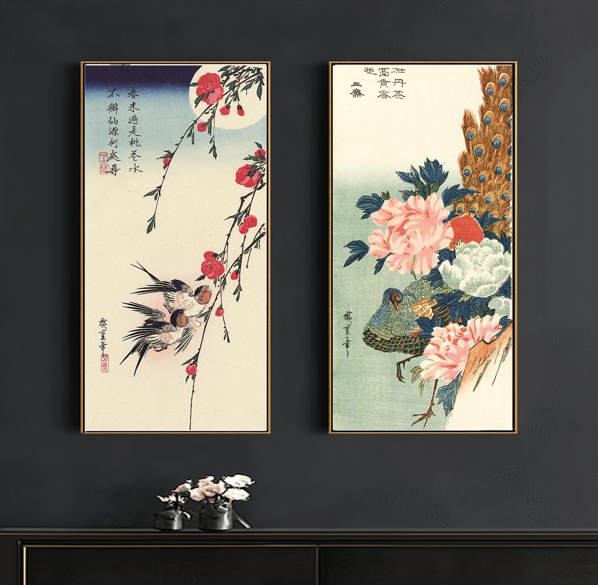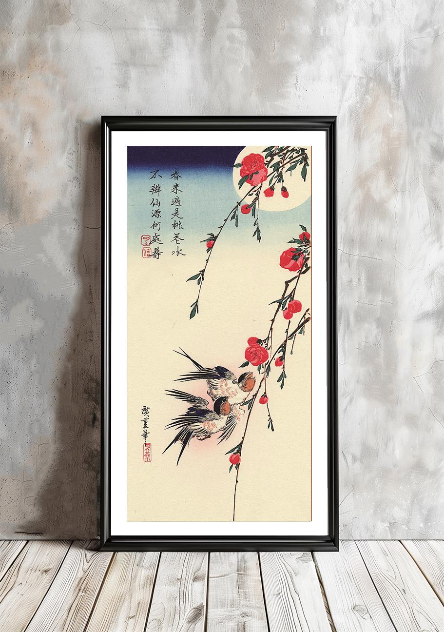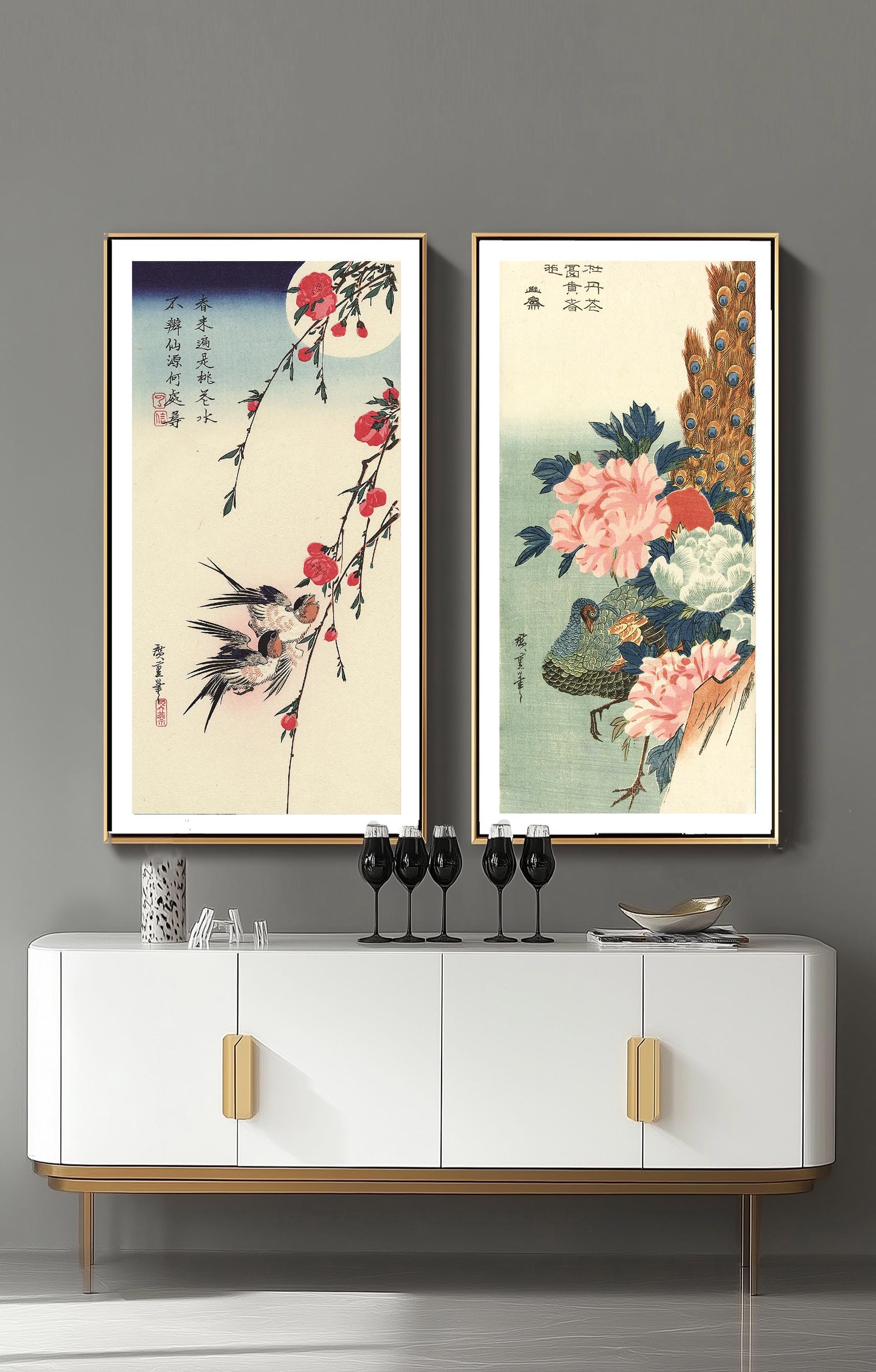 Ando Hiroshige Collection Set of 2 Peacock and Peonies, Swallow, Peach Blossoms and Moon Vintage Prints - Poster Paper, Canvas Print