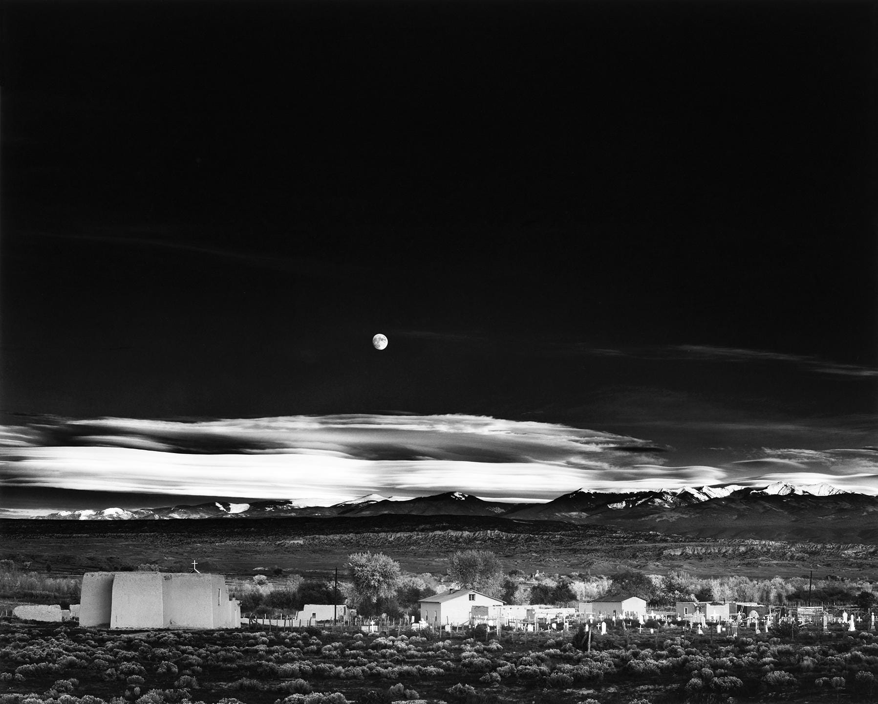 Many of his iconic photographs were taken in Yosemite National Park. One of his most celebrated images is Moonrise, Hernandez, New Mexico (1941), a striking photograph featuring a glowing moon above a small village and cemetery.