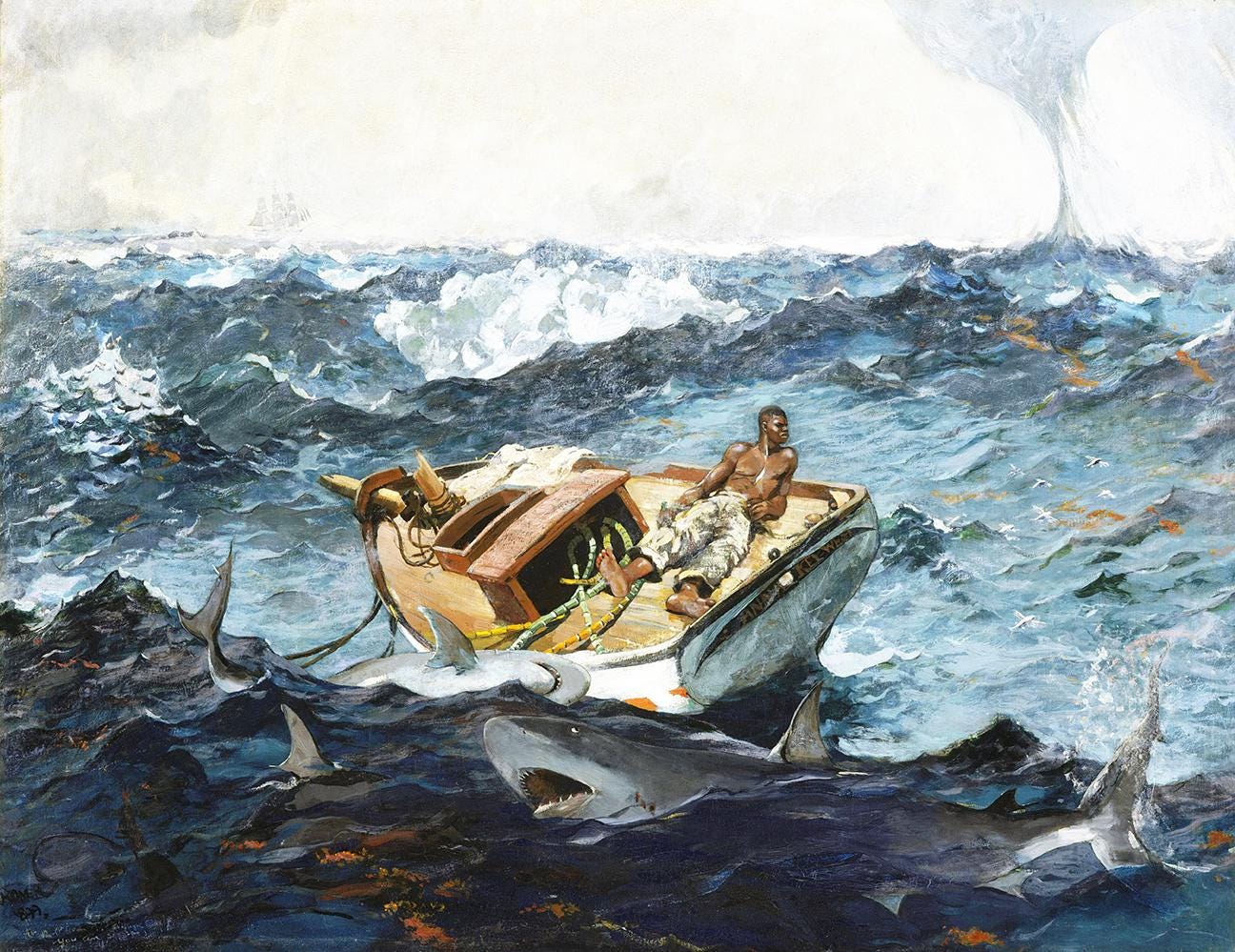 One of Homer’s most famous works, this painting shows a man alone in a small boat surrounded by sharks in a turbulent sea. It symbolizes human struggle against the powerful forces of nature. The dramatic waves and emotional intensity make it one of the masterpieces of American art.
